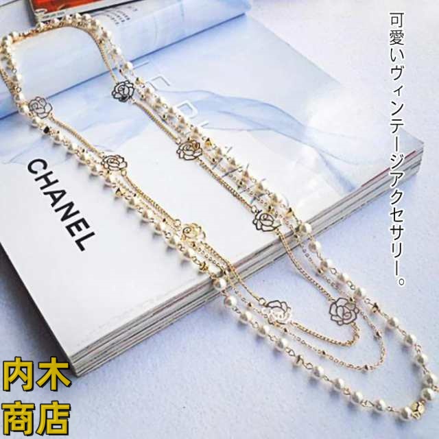 | 可愛いヴィンテージアクセサリー。 上品で綺麗なロングネックレス。 女性らしさが引き立つ3連スタイルを選ばず楽しめます。 シンプルな服に合わせるのもいいし、パーティーづかいもOK♪ | |