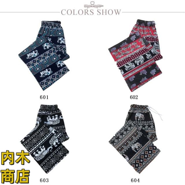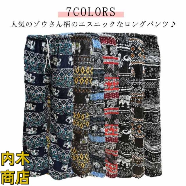 | 7COLORS 人気のゾウさん柄のエスニックなロングパンツ♪ サラサラの素材は涼しくて締め付けもなく穿き心地最高! ウェスト総ゴムで楽ちん♪ゆったりとしたサイジング。 エスニックファッションはもちろん、 おうち時間をゆったり過ごすルームウェアやパジャマにもぴったり。 | |