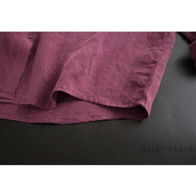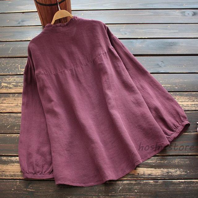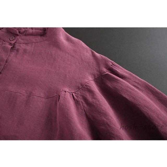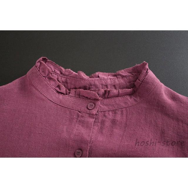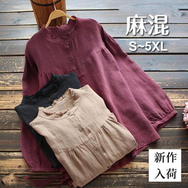 ブラウス レディースフリルネック おしゃれ トップス シャツ 麻混 長袖 無地 プルオーバー ブラウス トップス ロングシャツ きれいめ シャツ 立ち襟 40代