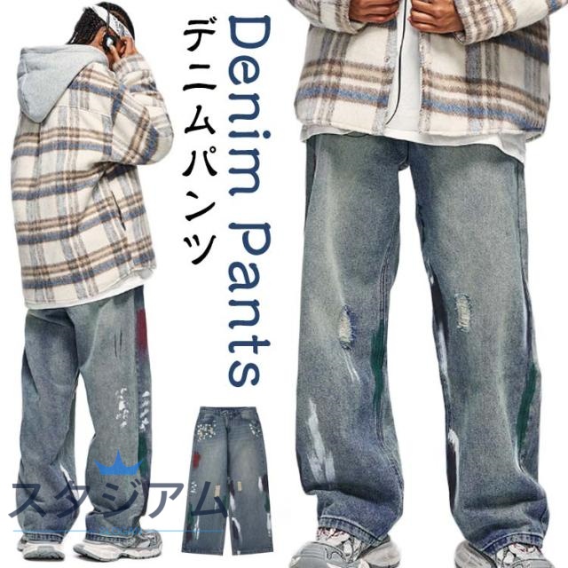 デニムパンツ パンツ ウォッシュ ゆったり ペンキ加工 メンズ ダメージ加工 ストレート パンツ デニムパンツ ワイドパンツ ジーンズ デニム ロング ストレート ジーンズ デニム 冬 ワイド リラックス ダンス衣装 ストリート系 イージーパンツ 春 秋 ストレートパンツ