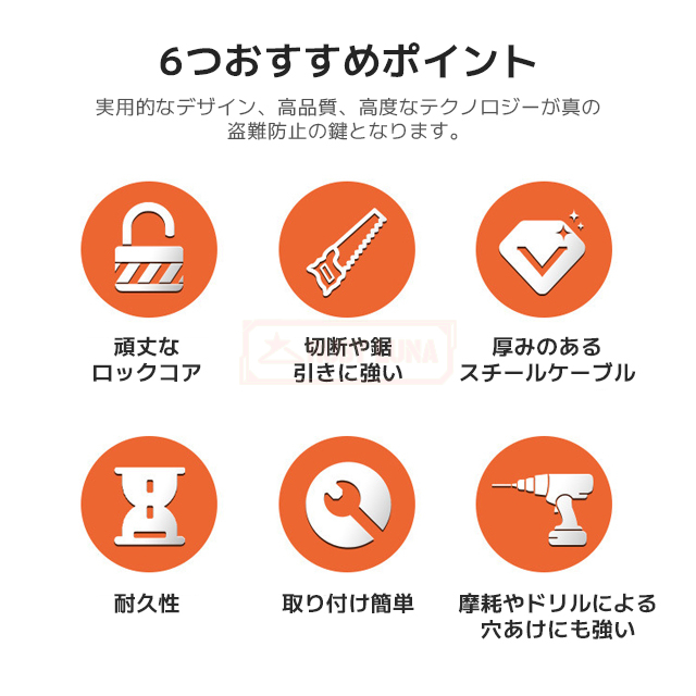 | 【高耐久ワイヤー】 | ◆柔軟性がありながらもしっかり切断に強いワイヤーで愛車を守ります。 |