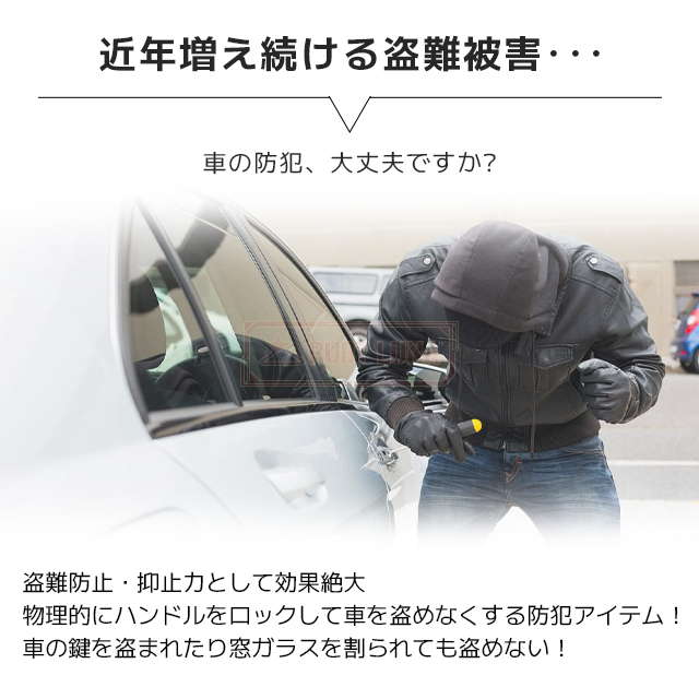 | 【愛車を守る強力防犯】 | ◆盗難防止・抑止力として効果絶大!物理的にハンドルを固定して盗難を防止するアイテムです。 ◆ハンドルに通してシートベルトバックルに装着するだけで簡単に防犯対策ができます。 ◆物理的にハンドルをロックするので車キーの紛失やリレーアタックにも対策可能です。 |