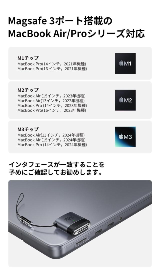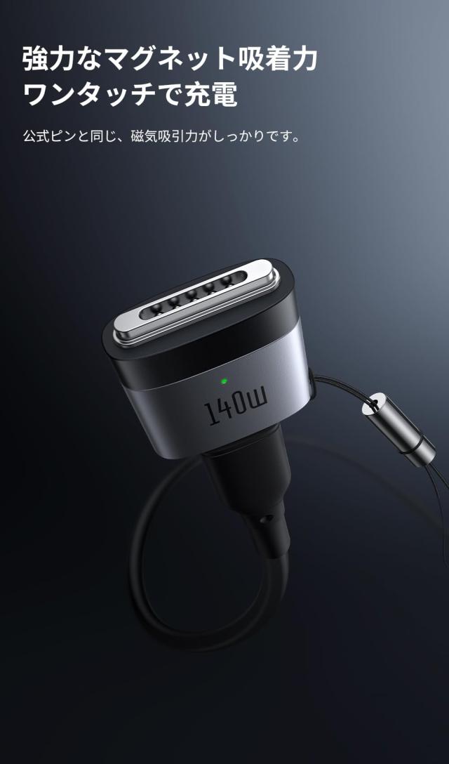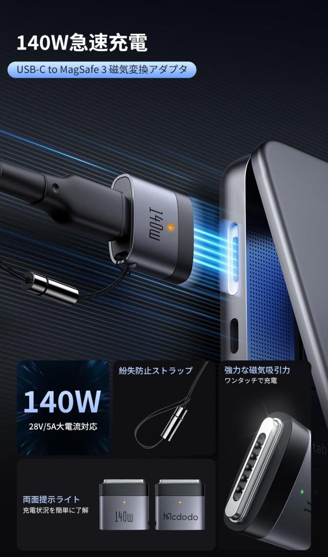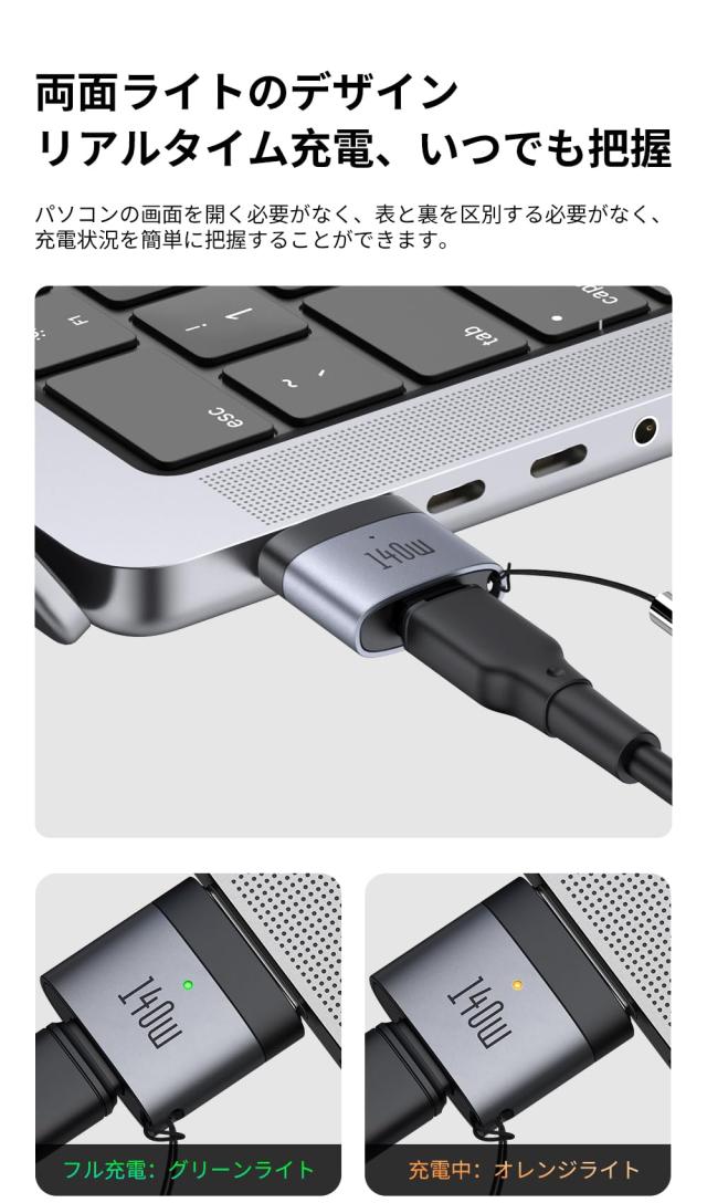 USB-C to Mag-safe 3 磁気変換アダプタ 140W急速充電 Mag-safe 3 コネクタ 強力な磁気吸引力 両面提示ライト付き Type-C to Mag-safe 3変換コネクタ タイプC マグセーフ3変換アダプタ MacBook Pro(M3/M2/M1 チップ)、MacBook Air(M3/M2 チップ)など対応