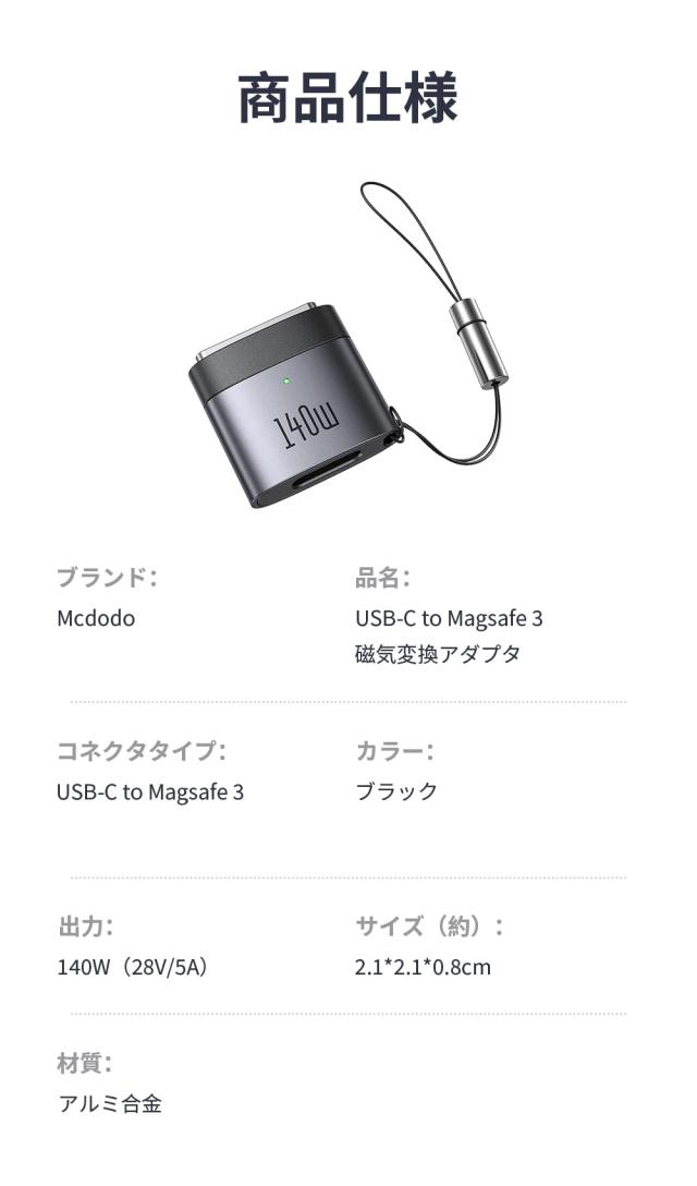 Mcdodo USB-C to Mag-safe 3 磁気変換アダプタ 140W急速充電 両面ライトのデザイン 2 紛失防止ストラップPrevious pageNext page1 アルミ合金シェル 2 商品仕様 Mcdodo 人気商品!お勧めるUSB-C to C & Magsafe3ケーブルカートに入れるUSB-C to Magsafe3 充電ケーブルカートに入れるUSB-C to Lightning 変換アダプタカートに入れるLightning to USB-C 変換アダプタカートに入れるUSB-C to Micro USB 変換アダプタカートに入れるUSB-C to Lightning 変換アダプタ