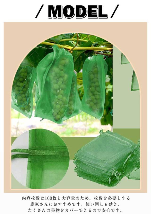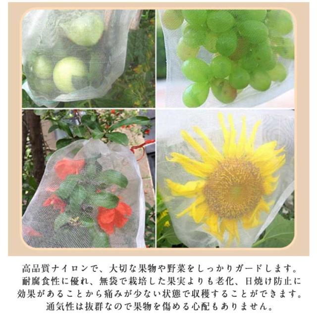 | 虫や鳥から丹精込めて育てた果物を守る防虫、防鳥ネットです。栽培するものによって必要になるサイズが異なることから、大きさが違う2種類のネットをご用意いたしました。 内容枚数は100枚と大容量のため、枚数を必要とする農家さんにおすすめです。使い回しも効き、たくさんの果物をカバーできるので安心です。 巾着袋のように予め袋口に口を縛る紐が付いているため、袋にかぶせたいものを入れ、口を閉めるだけです。開閉にも非常に便利です。袋に入れたまま果実を保存できる。ブドウ、リンゴ、イチゴ、イチジク、植物、野菜、花を保護し、植物を健康に保ちます。 高品質ナイロンで、大切な果物や野菜をしっかりガードします。耐腐食性に優れ、無袋で栽培した果実よりも老化、日焼け防止に効果があることから痛みが少ない状態で収穫することができます。通気性は抜群なので果物を傷める心配もありません。 通気性が良いメッシュ素材を使用しているため、害虫、害鳥対策だけでなく、種びたし、催芽、花粉単離、種子保管、完熟栽培の促進など様々な用途でご使用いただけます。 害虫、害鳥対策だけでなく、種びたし、催芽、花粉単離、種子保管、完熟栽培の促進など様々な用途でご使用いただけます。 | |