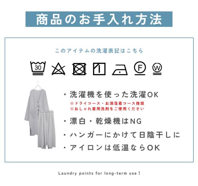 【カーディガン】着丈は膝下まで隠れ、袖丈は手の甲が隠れる長さです。最初に着た時に、想像よりも軽く感じ、快適な着心地でした。【パンツ】股下がかなり広くストレスフリーな穿き心地でした!丈はくるぶしにかかる長さで、ウエストは紐を絞らなくてもズレる心配はありませんでした。