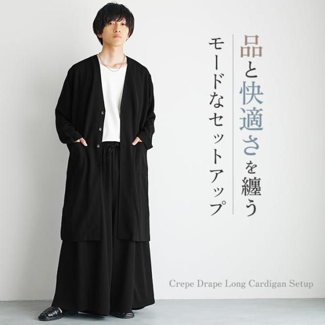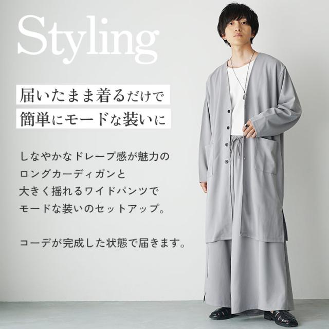 ロング丈のカーディガンが生み出す縦ラインとたっぷりと幅感をとり「袴」のようなAラインのシルエットが特徴的なワイドパンツがモードな存在感を演出するセットアップです。