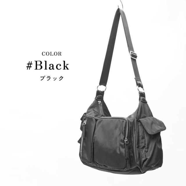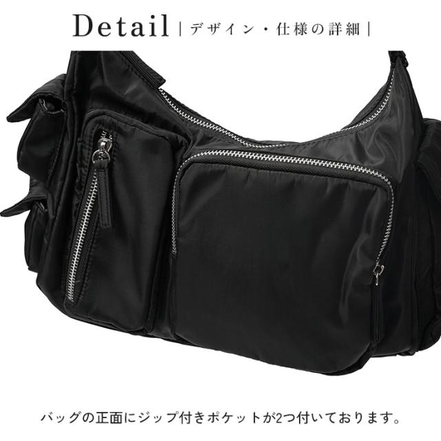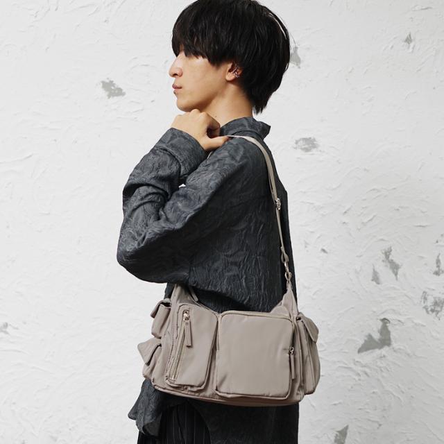 フロントと両サイドに収納力のあるポケットを配置したナイロン素材のショルダーバッグ。