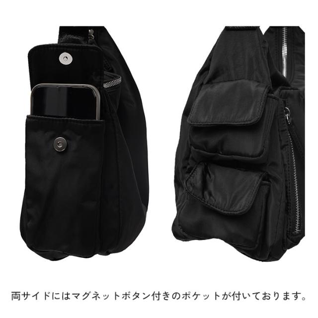 フロントと両サイドに収納力のあるポケットを配置したナイロン素材のショルダーバッグ。バッグそのものは大きすぎず程よいサイズながらも、一定の収納力のあるポケットが付属しており、使い勝手は抜群。さらに、それぞれのポケットはマグネットボタンやジップでしっかりと蓋ができるため、安全面でも安心な優秀なバッグです。