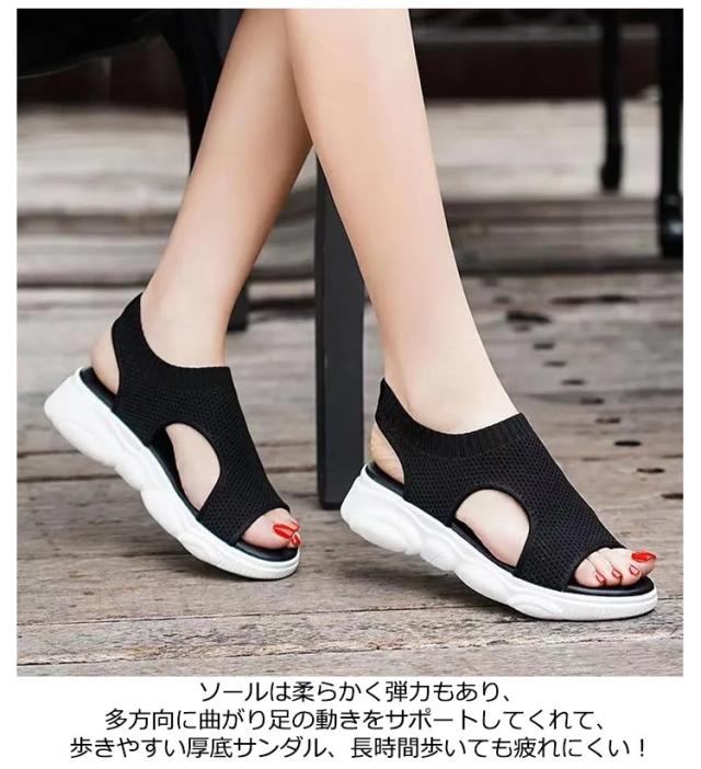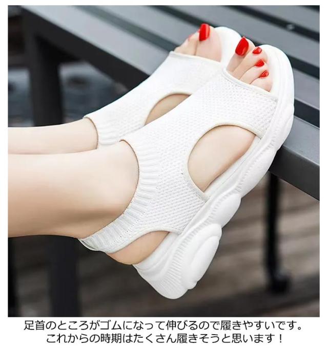 | シンプルデザインの厚底スニーカー。 通気性が良く暑い日でも足元は快適。 ソールは柔らかく弾力もあり、多方向に曲がり足の動きをサポートしてくれて、歩きやすい厚底サンダル、長時間歩いても疲れにくい! ファッション性に優れたスポーツサンダル。 足首のところがゴムになって伸びるので履きやすいです。これからの時期はたくさん履きそうと思います! | |