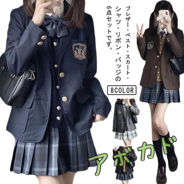 | ブレザー・ベスト・スカート・シャツ・リボン・バッジの6点セットです。 2ボタンブレザーでありながら、きれいなシルエットを実現。 スカートの柄を引き立て、脚をスッキリ見せてくれます! アクセントのリボンが襟元を華やかにし全体のコーディネートを引き立てます。 入学式、卒業式、その他学校行事、面接など幅広い場面でご利用いただけます。 SサイズからXLの大きなサイズまで幅広いサイズ展開も人気の一つです。 | |