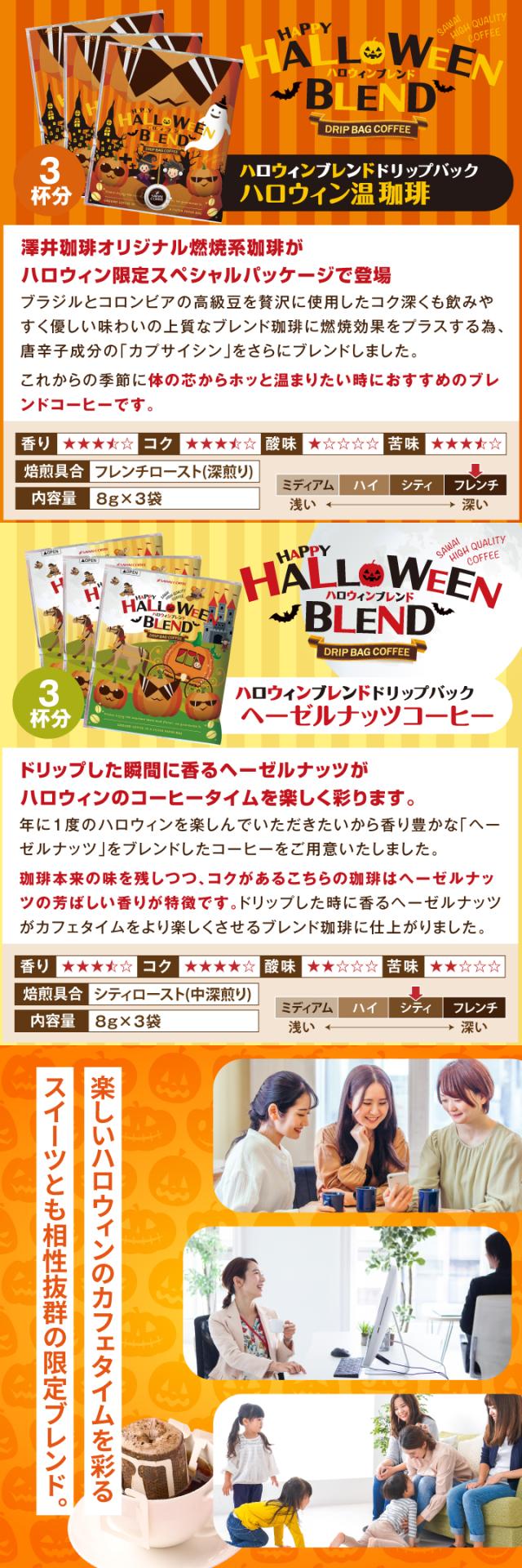 | 内容量 | ・ハロウィンブレンド 8g×4袋 ・ハロウィンヘーゼルナッツコーヒー 8g×3袋 ・ハロウィン温珈琲 8g×3袋 |