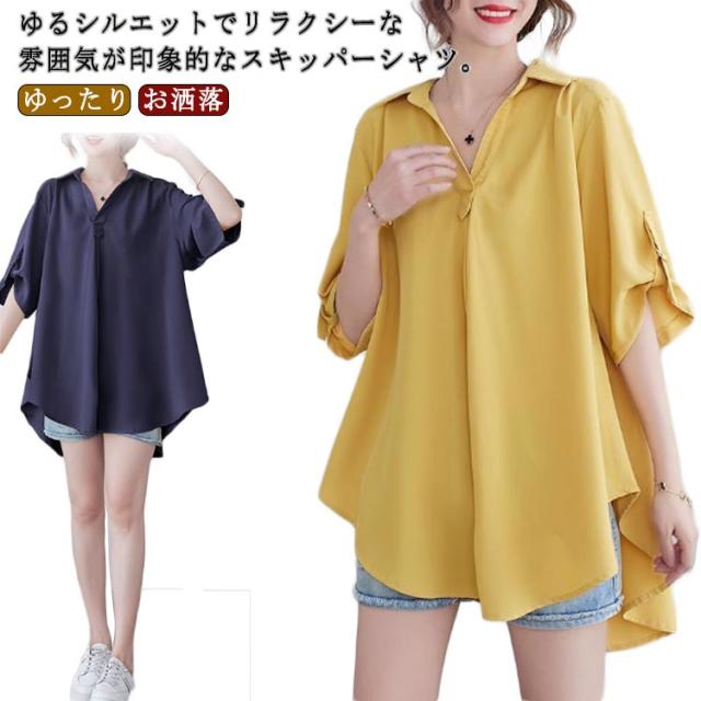 シフォン トップス スキッパーシャツ シャツ 春 シャツブラウス 半袖 無地 大きサイズ チュニック ゆったり 体型カバー 春夏 かわいい お洒落 レディース 夏