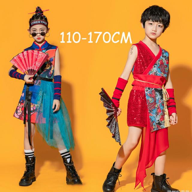 キッズダンス衣装 青色 赤 セットアップ チャイナ風 女の子 男の子 パンツ ヒップホップ ノースリーブ ダンス 衣装 デニムパンツ ダンスウェア 子供服 シ ゆったり