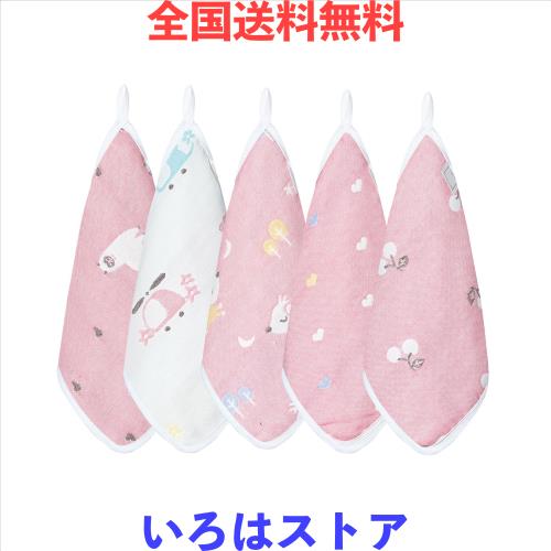 [HOOMCOOM] ガーゼハンカチ ベビー 6層 ガーゼタオル 赤ちゃん ループ付き 名前を書ける 保育園用 綿100% 25x25cm 5枚セット ピンク