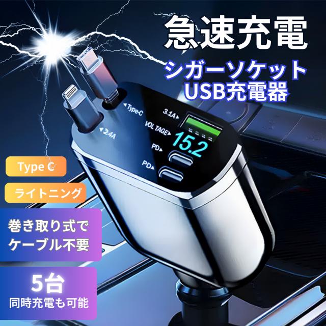 シガーソケットUSB充電器 シガーソケット カーチャージャー 車載 充電ケーブル 充電器 5in1 リール式 スマホ充電 急速充電 シガーチャージャー 伸縮ケーブル USB充電