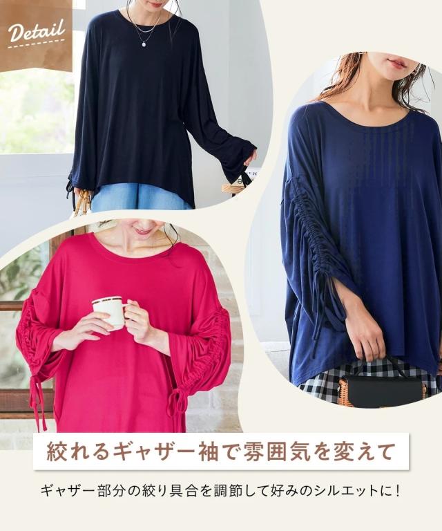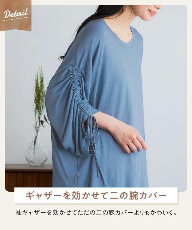 チュニック レディース たっぷりドレープ袖ギャザー 接触冷感 UVカット 秋 体型カバー お尻隠れる