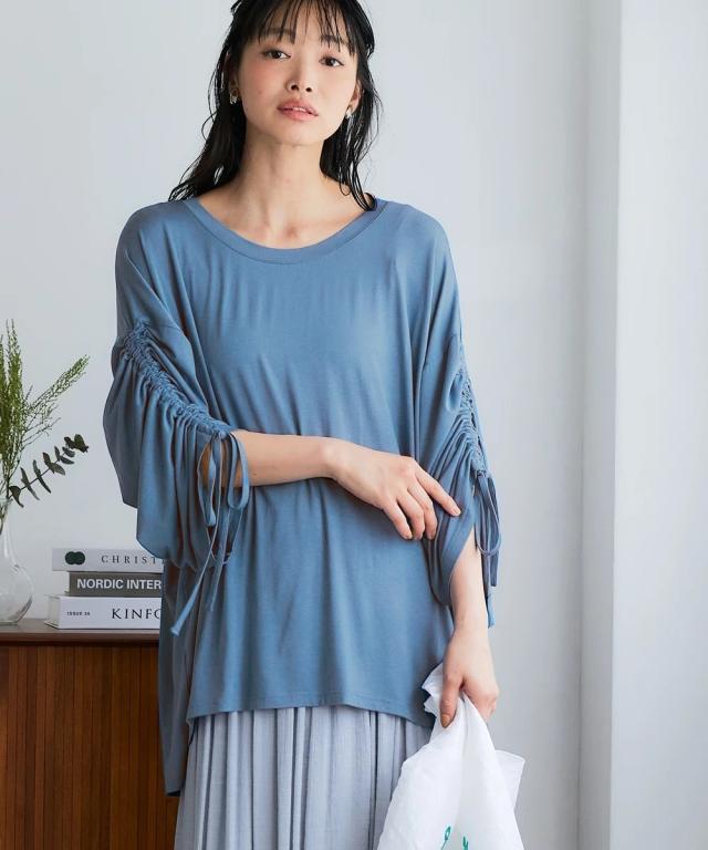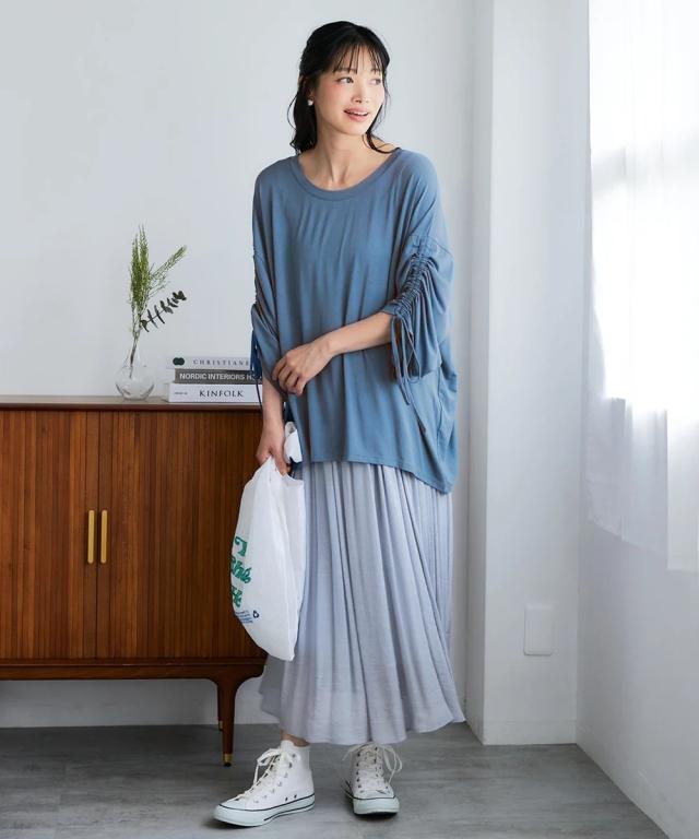 猛暑続きの秋に! 接触冷感&UVカットで、毎日を快適に、そしておしゃれに。 毎日の着やすさをトコトン追求したデイリーウェアが届きました。 動きやすくて楽ちん、コーデ不要で楽ちん、洗濯も楽ちん! この一枚で、あなたの日常がもっと輝き始めます。 ■デザイン ゆったりとしたシルエットながら、計算されたドレープ袖が女性らしさを引き立てるチュニックです。 袖口にはドロスト仕様が施されており、お好みのギャザー具合に調整可能。 腕を華奢に見せる効果も期待でき、気になる二の腕も自然にカバーしてくれます。 前後差のある着丈は、ヒップラインをさりげなくカバーしつつ、 前からはスッキリとした印象を与え、どんなボトムスとも相性抜群です。 体型カバーを叶えながらも、トレンド感のあるデザインで、 忙しい毎日でもおしゃれを楽しみたい大人女性にぴったりの一枚です。 大きいサイズ展開もございますので、幅広い体型の方にお選びいただけます。 ■素材 レーヨン95%、ポリウレタン5%の混紡素材は、 とろけるような肌触りで、一度着たら手放せない心地よさです。 レーヨン特有のなめらかなドレープ感は、上品な印象を与え、 ポリウレタンを配合することで、程よいストレッチ性をプラ