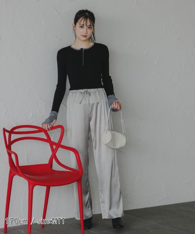 【高身長な方向け】程よいゆとり感でリラックス感のあるサテンワイドパンツ ■デザイン ・ウエスト総ゴムでらくちんの履き心地・セミワイドシルエットで程よいゆとり感 ■素材 ・落ち感と光沢感が美しいサテン素材を使用 滑らかで上品な落ち感がポイント。・厚すぎず、薄すぎない晩夏以降にぴったりな生地です。 ■おすすめのスタイリング Tシャツやニットと合わせたカジュアルなスタイリングはもちろん、シャツなどを合わせたきれいめのスタイリングにもぴったりです