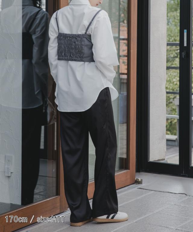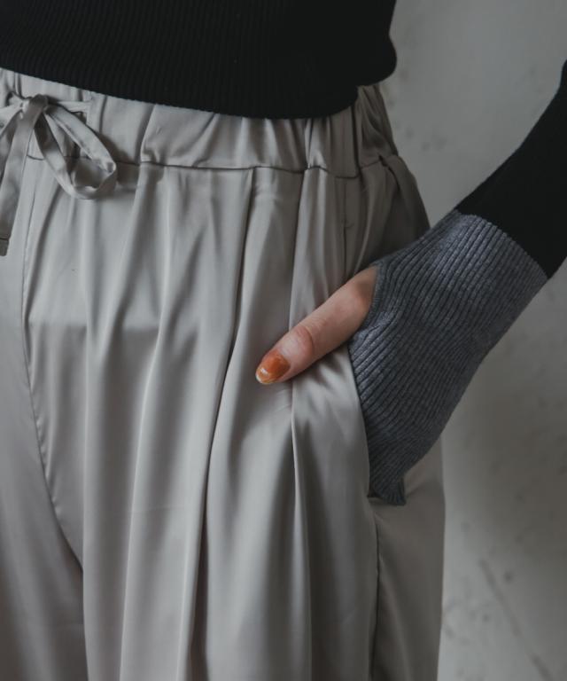 【高身長な方向け】程よいゆとり感でリラックス感のあるサテンワイドパンツ ■デザイン ・ウエスト総ゴムでらくちんの履き心地・セミワイドシルエットで程よいゆとり感 ■素材 ・落ち感と光沢感が美しいサテン素材を使用 滑らかで上品な落ち感がポイント。・厚すぎず、薄すぎない晩夏以降にぴったりな生地です。 ■おすすめのスタイリング Tシャツやニットと合わせたカジュアルなスタイリングはもちろん、シャツなどを合わせたきれいめのスタイリングにもぴったりです