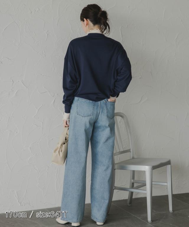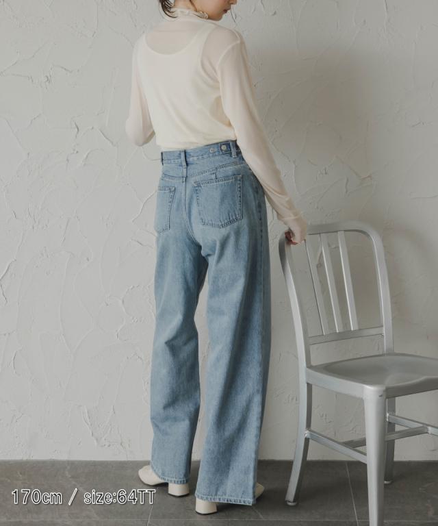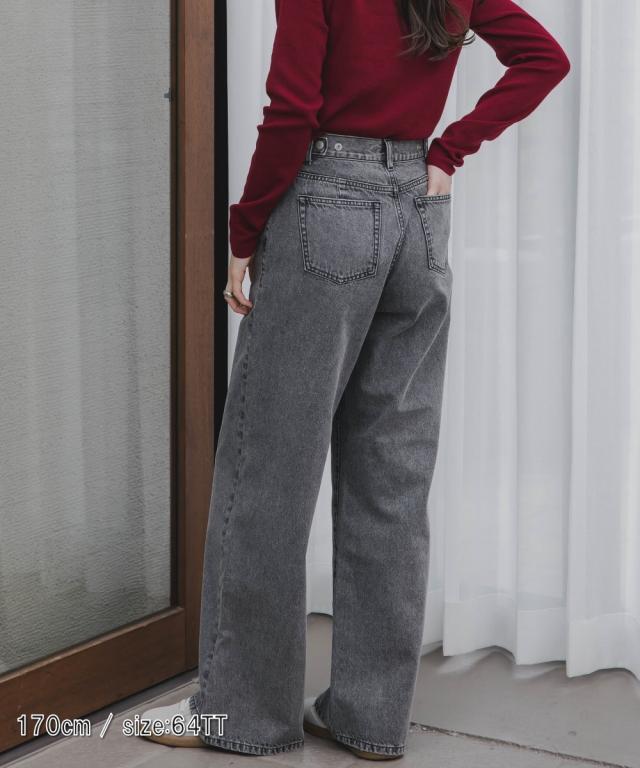 【高身長な方向け】ウエストが調節できるワイドストレートデニムパンツ ■デザイン ・ウエスト周りはすっきり見えるシルエット感に。・ダボつきすぎない程よいゆとり感あるワイドストレートシルエット。・ウエスト後ろ両脇のボタンでウエストサイズが調整可能です。 両方のボタンを内側に留めることで約6cm縮まります。 ■素材 ・こなれ感が叶う加工感にこだわったデニム素材。・程よいゆとり感があるので肌に貼り付かずご着用いただけます。 ■おすすめのスタイリング 絶妙なゆとり感あるシルエットにこだわったデニムパンツ。また、ウエスト周りが大きいとのお声から調整できるデザインに。どちらで着用しても大きくシルエット感は変わりません。トップスのアイテムを問わずスタイリングが可愛くまとまります