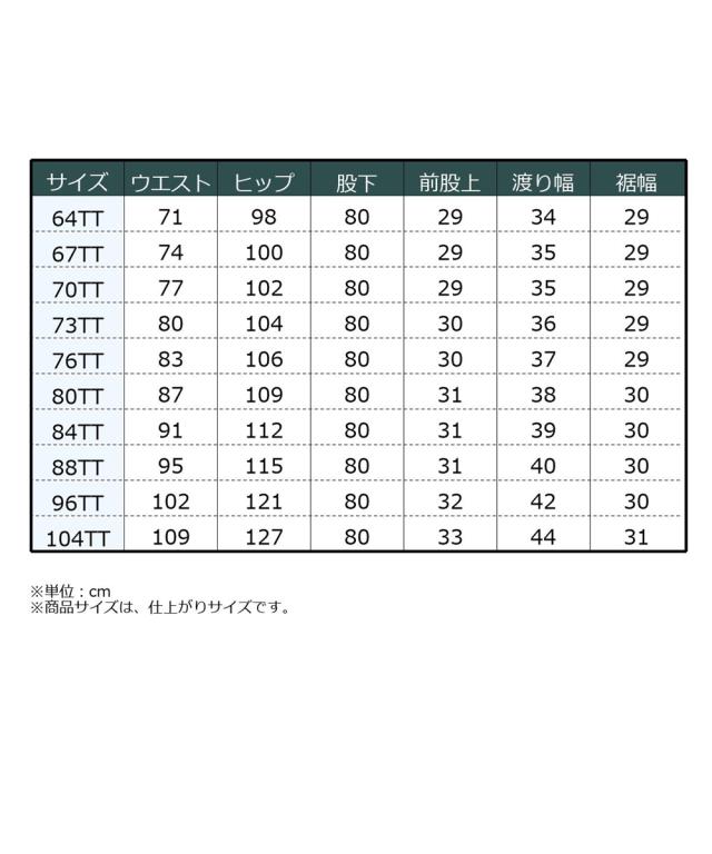 品質:綿95%・レーヨン5% 透け感:なし 伸縮性:なし 生地の厚み:普通 光沢感:なし 裏地:なし ポケット:あり(前2つ・後2つ・コインポケット1つ) ウエスト:前ボタン・ファスナー開き 季節:春・秋 シルエット:普通 その他:ウエスト後ろボタンで多少調節可能です。 原産国:ベトナム製 備考:洗濯機OK ※単位:cm ※商品サイズは、仕上がりサイズです。