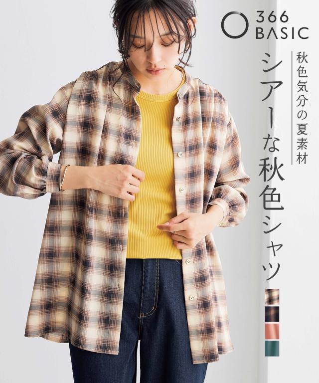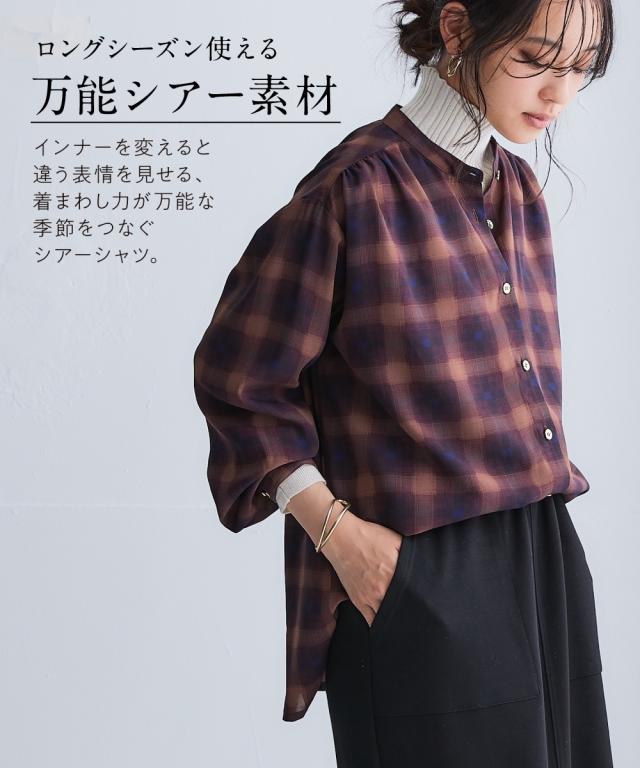 秋色気分のシアー素材シャツが新登場 ■デザイン 女性がきれいに見えるサイジングにこだわったシアーシャツ。 旬のバンドカラーで顔周りがすっきり見えます。 秋服が着たいけど夏が長くてなかなか着れない。 そんな声にお応えした秋色シアーシャツです。 ■素材 防しわ機能付きなのでシャツなのにしわになりにくくお手入れ簡単! 多くのお声からお手入れ簡単な素材にこだわりました。 ロングシーズン使える万能なシアー素材で、インナーを変えるだけで簡単に違う着こなしができます。 大人に似合う程よい透け感素材は女性らしい上品な透け感です。 ■おすすめのスタイリング 羽織りとして、シャツとして、ベーシックシャツだからきれいめにもカジュアルにも自由自在。