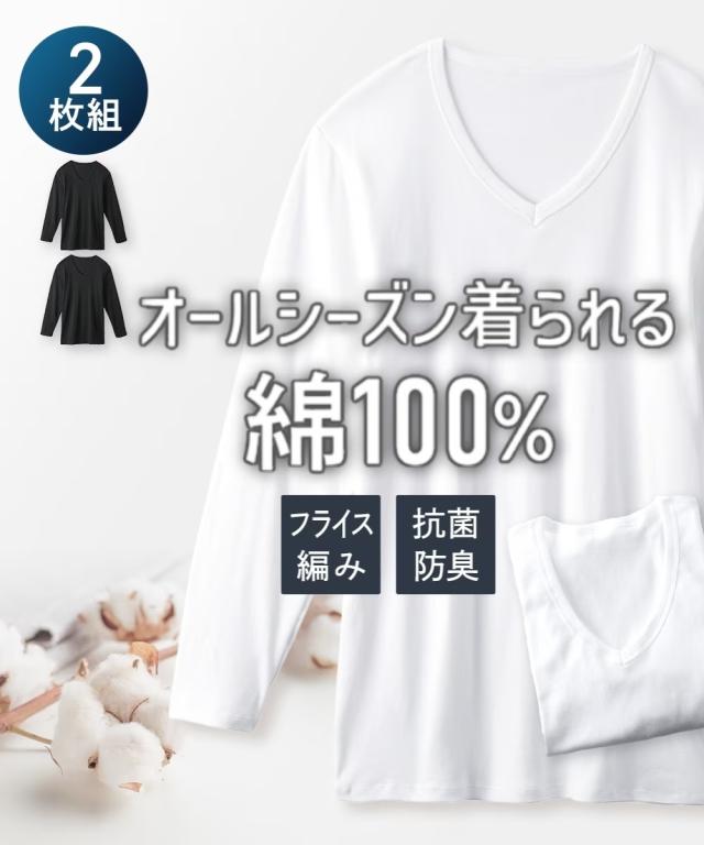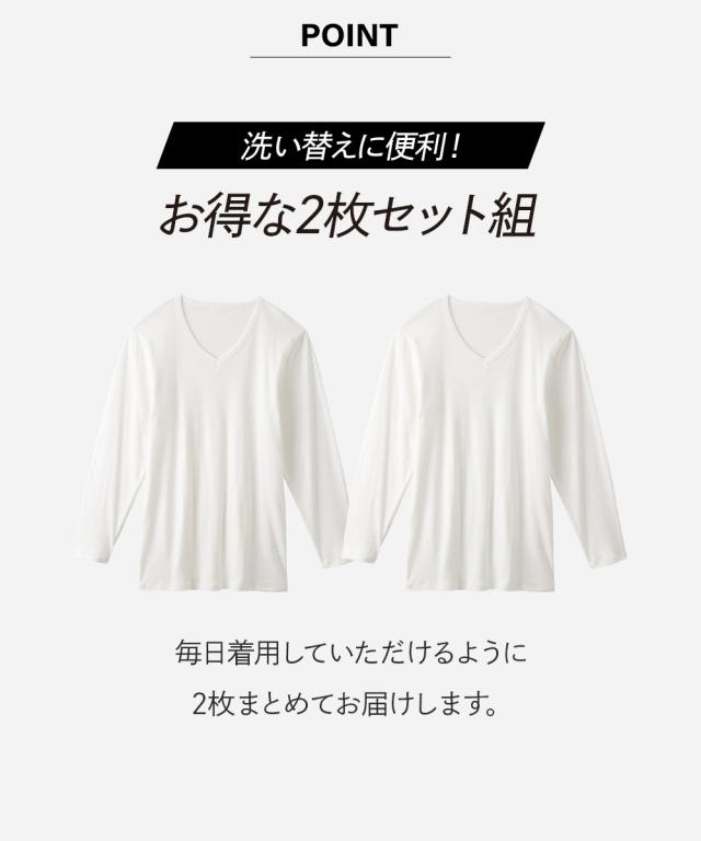 インナー シャツ 長袖 メンズ 抗菌防臭 加工 綿100% フライス Vネック 2枚組 春 夏 秋 冬 男性 肌着 下着