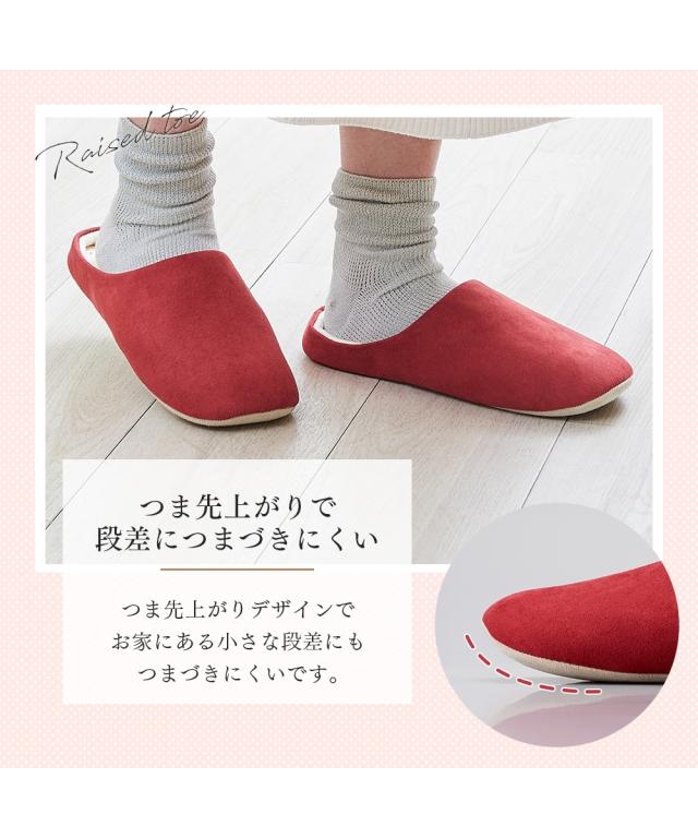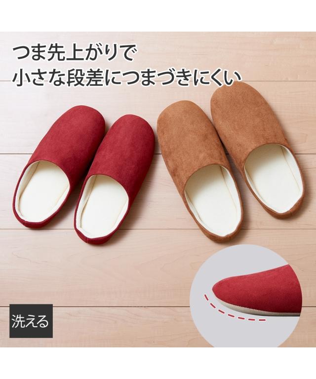 つま先が少し上がった設計で、つまずきにくいルームスリッパです。 敷居やラグの端、トイレや浴室の入口など、家の中にひそむ小さな段差に引っかかりにくく、家の中を安心して歩けます。 外側は上品で、薄地で軽く丈夫なシャンブレー生地。 内側には肌ざわりのよいパイル素材を使い、素足でも気持ちいい履き心地です。 かかとは浅く包み込むような形状で、脱ぎ履きがしやすいのが特徴。 サッと脱いで、パッと履けるので、ベランダやトイレ、玄関周りなどの出入りもスムーズで快適です。 また、かかと裏には滑り止め加工が施され、フローリングでもすべりにくい仕様。 汚れても気軽に手洗いができて、清潔さもキープできます。 レッド=Mサイズ、ブラウン=Lサイズの2種類を用意しています。
