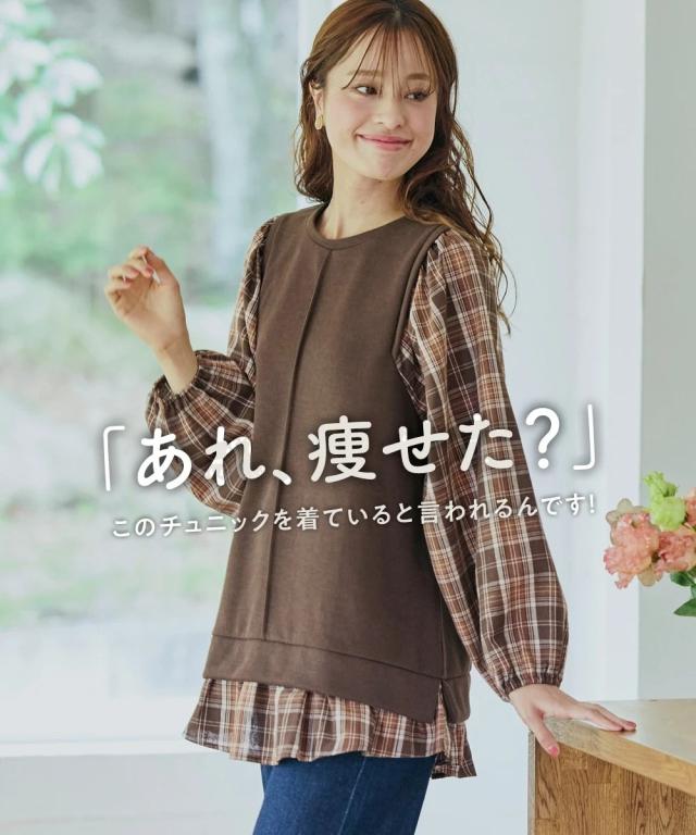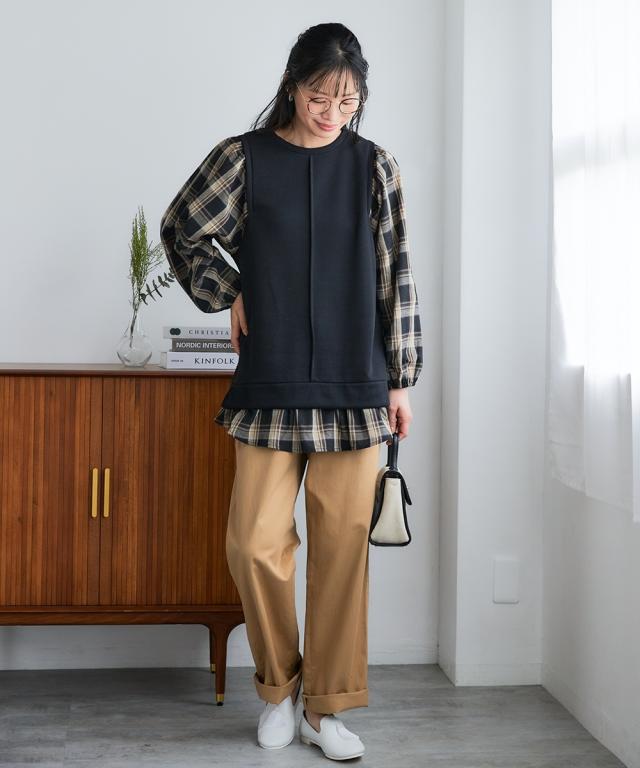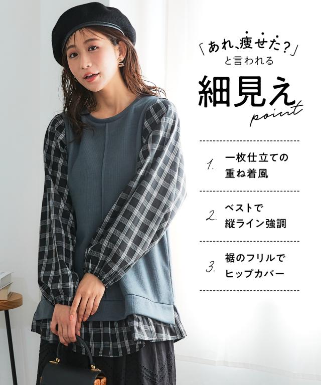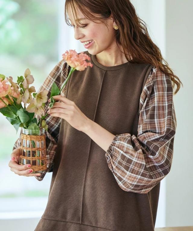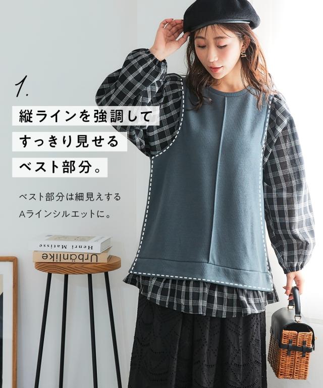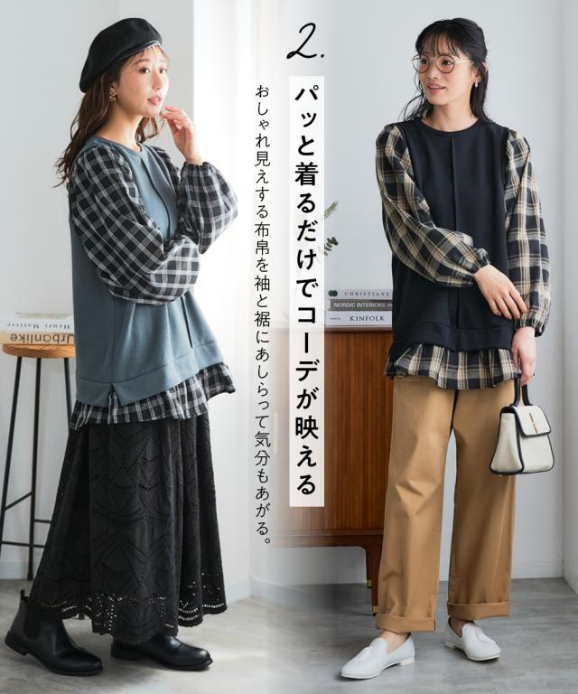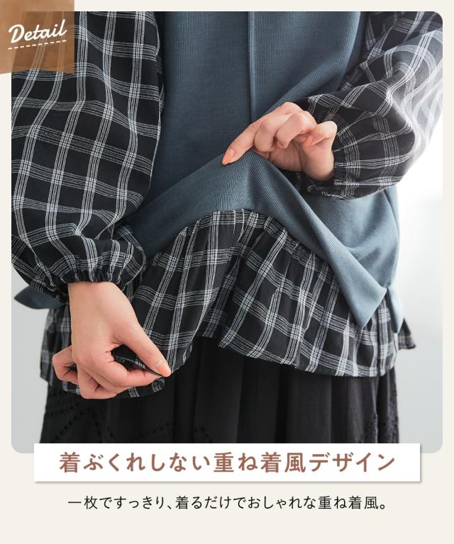 異素材使いと縦ラインで、華奢見えも叶うボリューム袖トップス。コーデに迷う時間も、着心地のストレスも、もう心配いりません。動きやすくて、着るだけでおしゃれが完成する一枚です。 ■デザイン 毎日の着こなしを格上げするこだわりのデザインが魅力です。身頃は無地、袖と裾にはチェック柄を大胆に組み合わせた異素材使いで、一枚でレイヤードスタイルが完成。気になるお腹周りやヒップを自然にカバーする長め丈は、体型カバーを意識する方に特におすすめです。さらに、身頃に入った縦の切り替えラインが、視覚的にすっきりとした印象を与え、華奢見え効果も期待できます。ふんわりとしたボリューム袖は、手首部分がゴム仕様になっているため、家事や作業の際にも邪魔にならず、機能性も抜群。シンプルなボトムスと合わせるだけで、こなれたおしゃれが叶う、まさに「コーデ不要で楽ちん」なアイテムです ■素材 肌触りが良く、吸湿性にも優れているため、一日中快適に過ごせます。程よい厚みで、インナーが響きにくいのも嬉しいポイント。どちらの素材もシワになりにくく、洗濯後のお手入れも簡単。まさに「洗濯も楽ちん」な、デイリーユースにぴったりの素材です。毎日の着用に耐えうる丈夫さも
