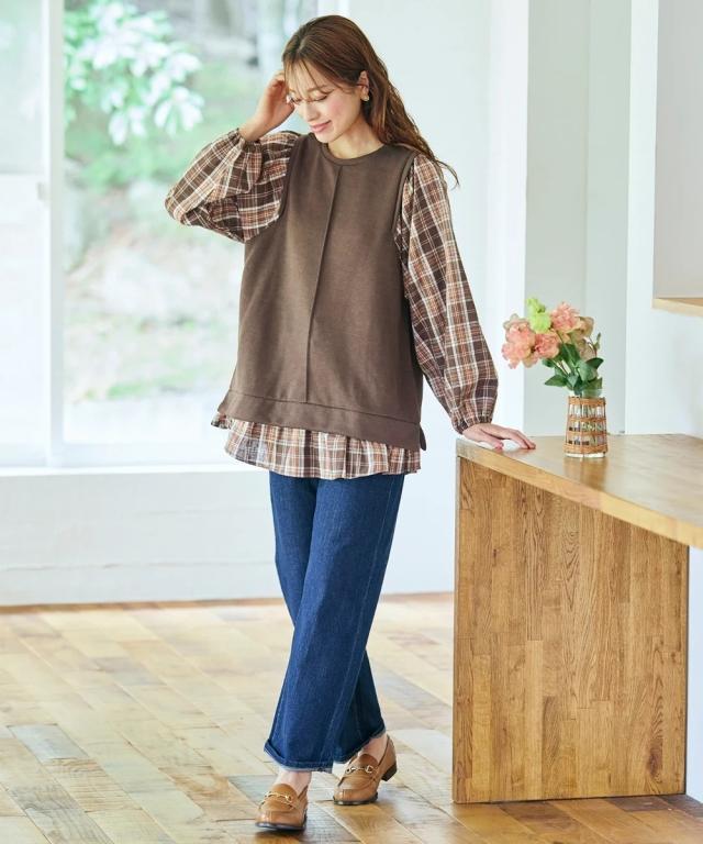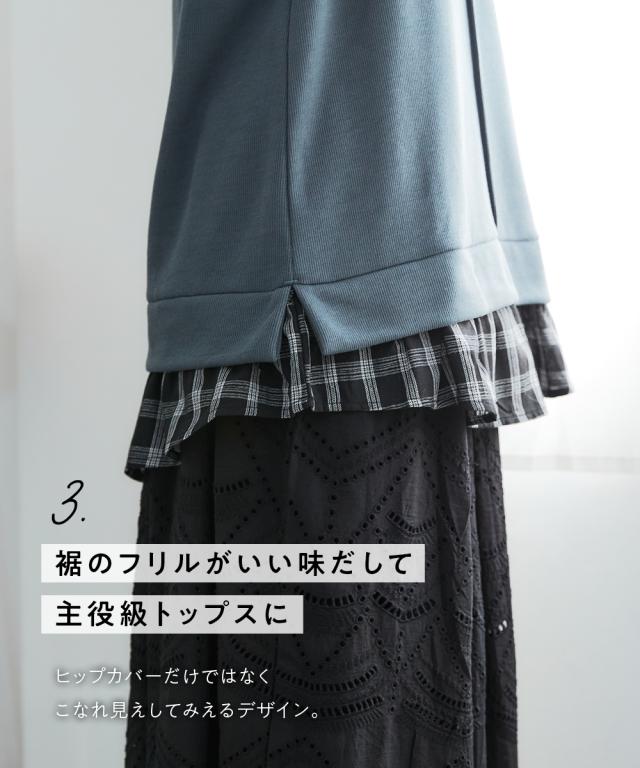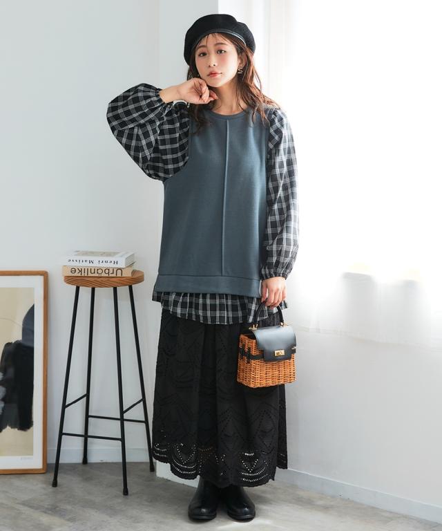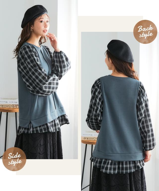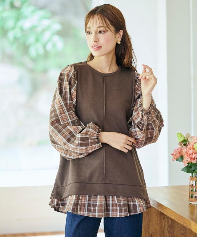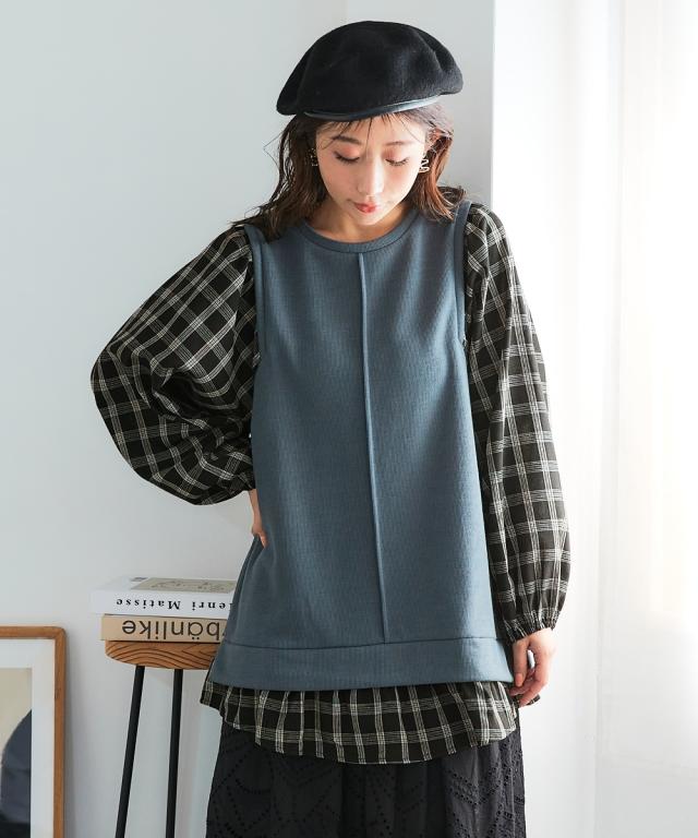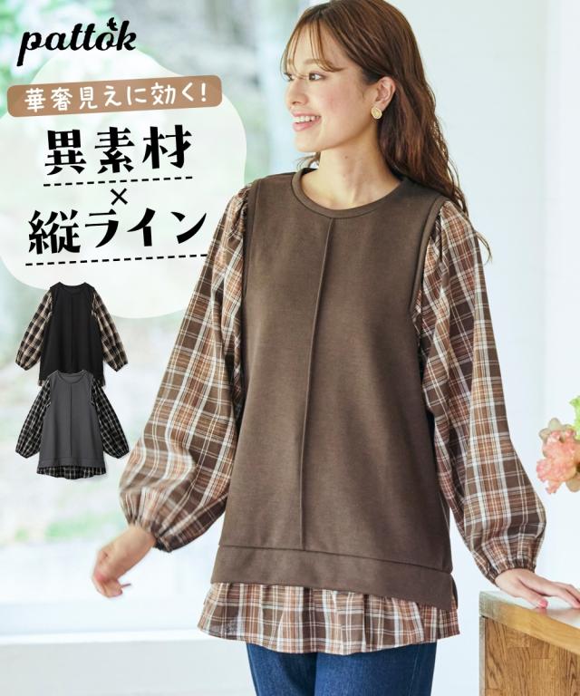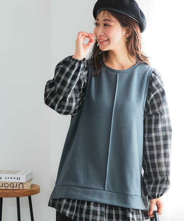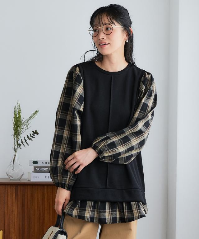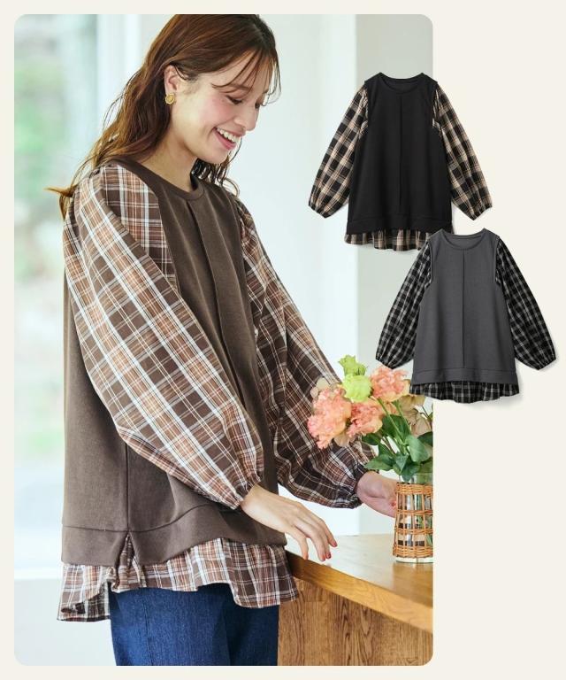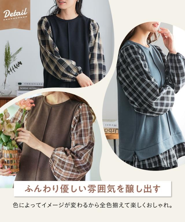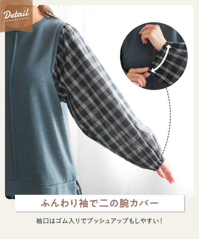 異素材使いと縦ラインで、華奢見えも叶うボリューム袖トップス。コーデに迷う時間も、着心地のストレスも、もう心配いりません。動きやすくて、着るだけでおしゃれが完成する一枚です。 ■デザイン 毎日の着こなしを格上げするこだわりのデザインが魅力です。身頃は無地、袖と裾にはチェック柄を大胆に組み合わせた異素材使いで、一枚でレイヤードスタイルが完成。気になるお腹周りやヒップを自然にカバーする長め丈は、体型カバーを意識する方に特におすすめです。さらに、身頃に入った縦の切り替えラインが、視覚的にすっきりとした印象を与え、華奢見え効果も期待できます。ふんわりとしたボリューム袖は、手首部分がゴム仕様になっているため、家事や作業の際にも邪魔にならず、機能性も抜群。シンプルなボトムスと合わせるだけで、こなれたおしゃれが叶う、まさに「コーデ不要で楽ちん」なアイテムです ■素材 肌触りが良く、吸湿性にも優れているため、一日中快適に過ごせます。程よい厚みで、インナーが響きにくいのも嬉しいポイント。どちらの素材もシワになりにくく、洗濯後のお手入れも簡単。まさに「洗濯も楽ちん」な、デイリーユースにぴったりの素材です。毎日の着用に耐えうる丈夫さも