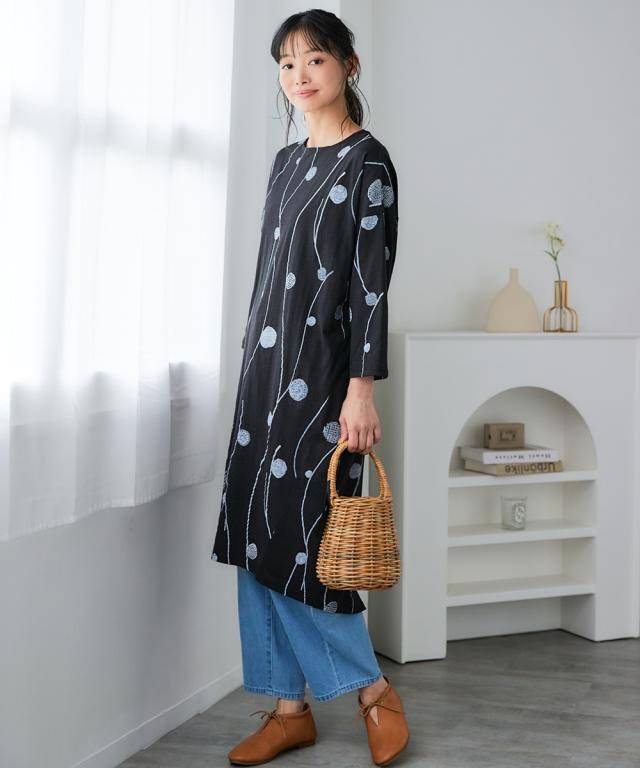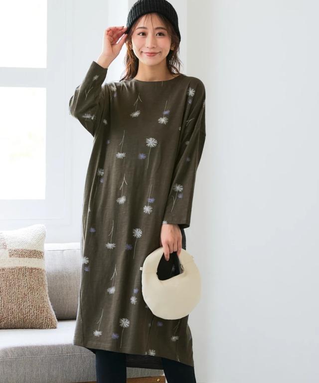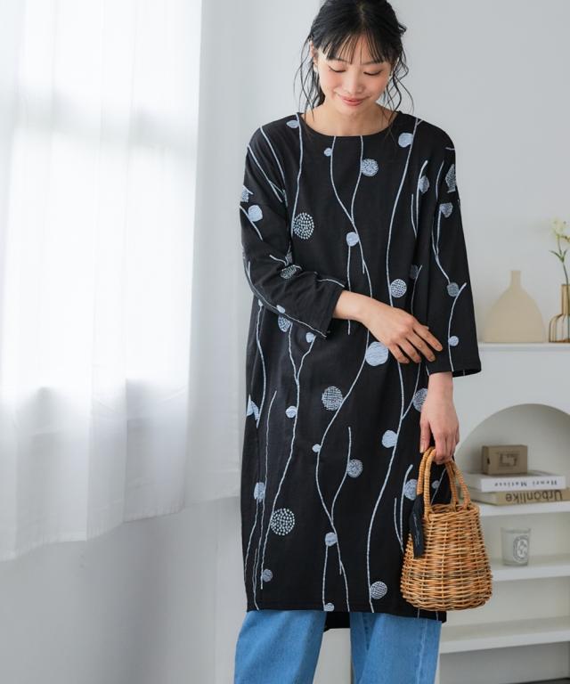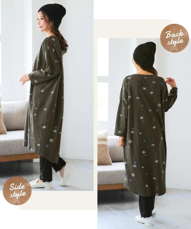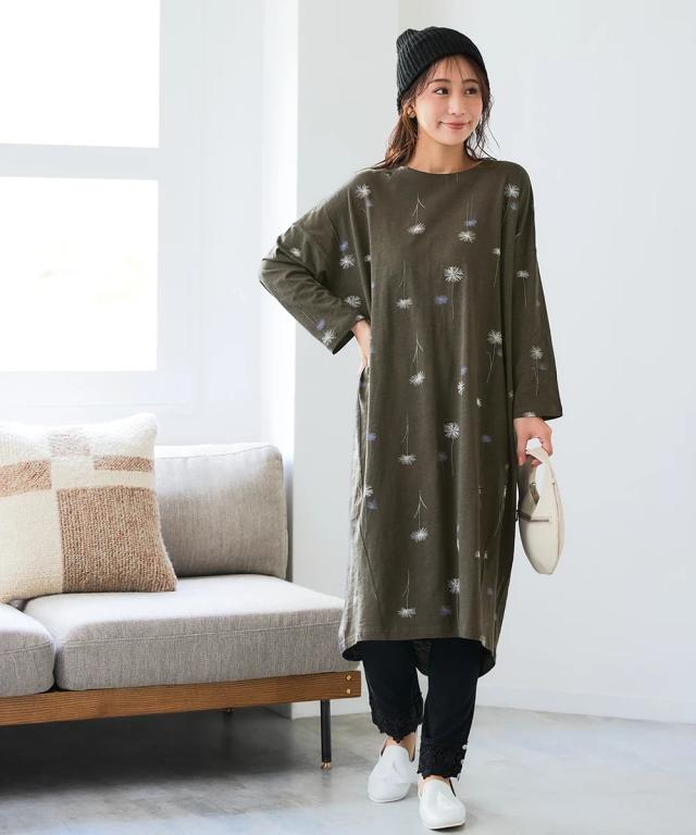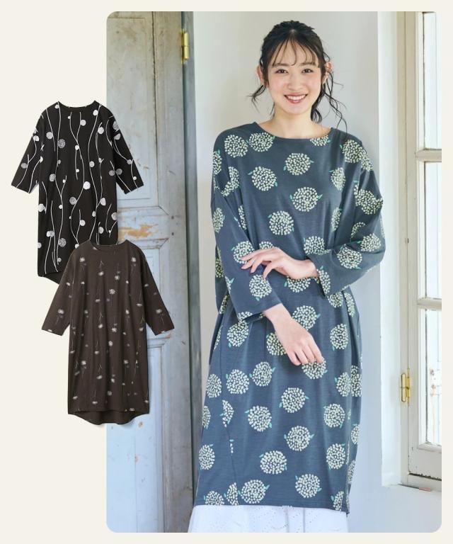 北欧柄が可愛い!肌触りさらりワンピースで、毎日をちょっと幸せに。 「いちばん大切な普段の日」を、もっと心地よく、もっと楽しく。 動きやすくて楽ちん、コーデ不要で楽ちん、洗濯も楽ちん! 願いを叶える、とっておきのデイリーウェアが届きました。 綿100%の優しい肌触りと、ゆったりとしたシルエットが魅力の8分袖ワンピース。 忙しい毎日でも、これ一枚でサマになるから、おしゃれをもっと気軽に楽しめます。 ■デザイン 体型カバーも叶う、ゆったりシルエットのワンピース。 気になる二の腕やお腹周りを自然にカバーしてくれる、絶妙なゆるシルエットが魅力です。 首元はすっきりとしたボートネックで、デコルテラインをきれいに見せてくれます。 手首が華奢に見え、家事や作業もしやすいのが嬉しいポイント。 裾は前後差のあるデザインで、動きやすさとこなれ感を両立。 レギンスやパンツとのレイヤードスタイルも楽しめます。 北欧柄の可愛らしいプリントは、大人の女性にも似合う上品なデザイン。 シンプルながらも存在感があり、一枚で着てもおしゃれに決まります。 ■素材 品質は綿100%。肌に触れるたびに心地よさを感じる、天然素材ならではの優しい肌触りが魅力です。 スラブカット