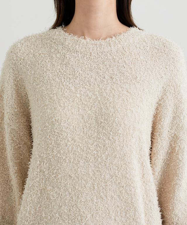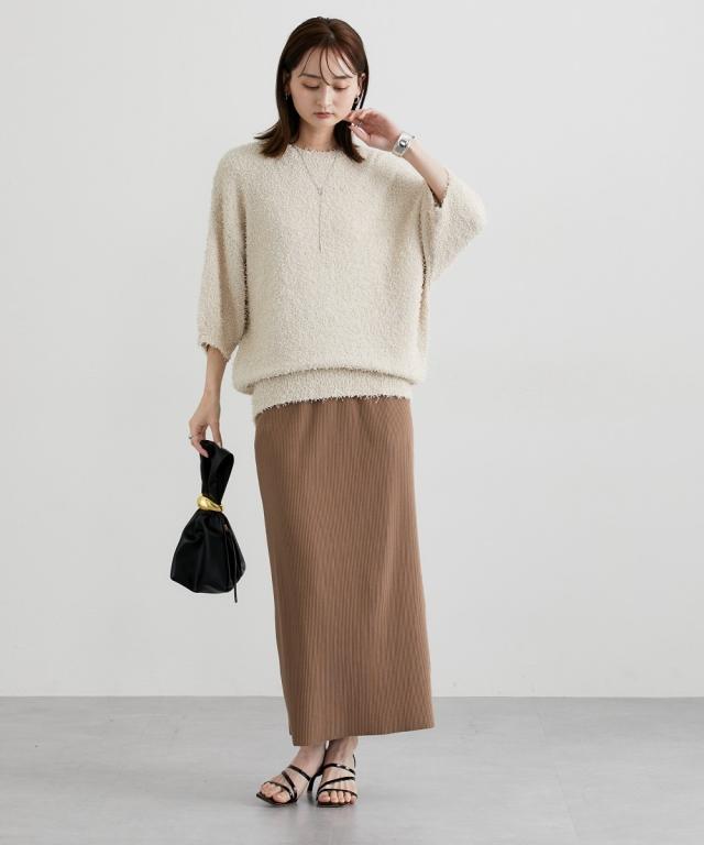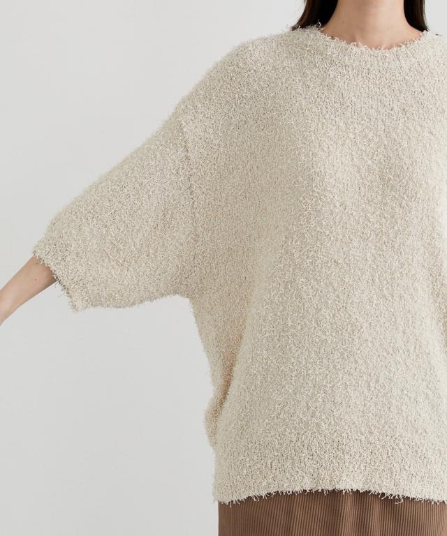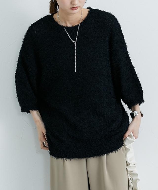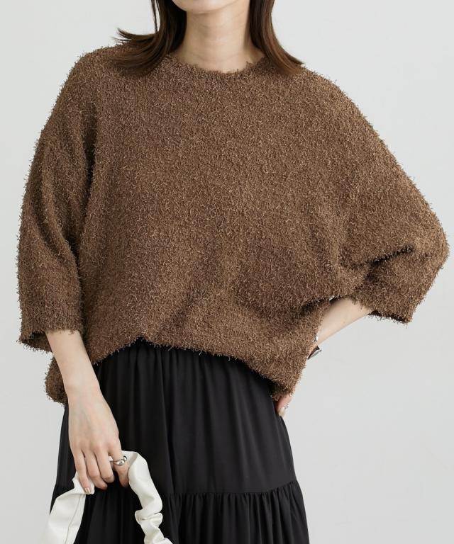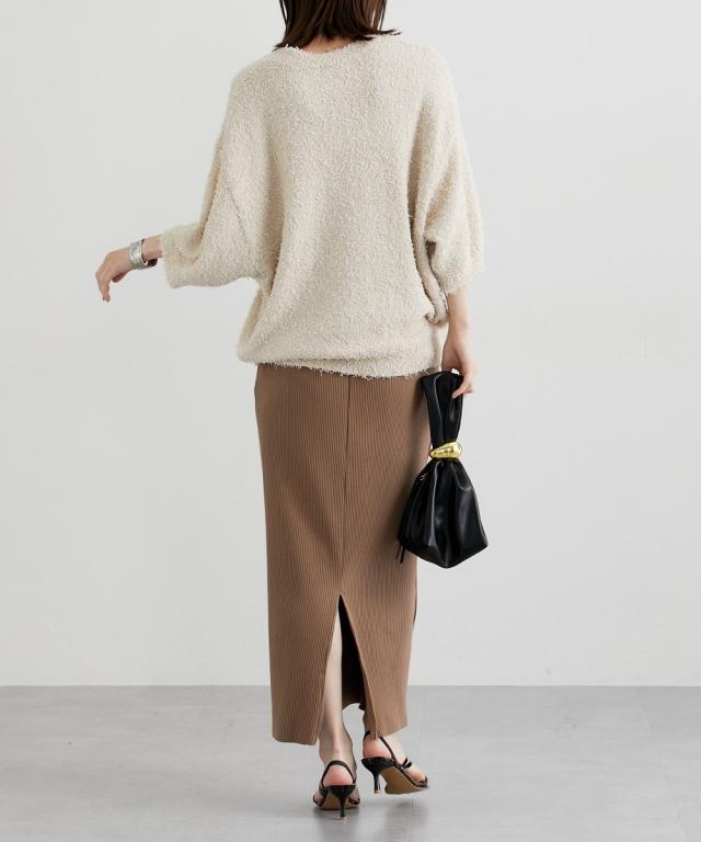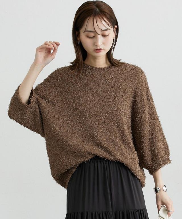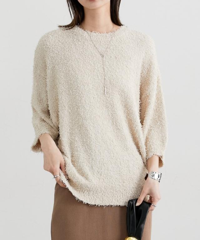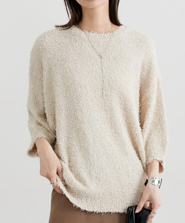 ■デザイン 前年人気のニットに新型でドルマンスリーブが入荷しましたゆるっとしたサイズ感とドルマンスリーブでこなれ感のあるスタイリングにぴったりのニットトップスです! ■素材 風合い抜群のカールヤーンニット。ランダムな毛足の長さで遊び心ある生地。伸縮性があり着心地抜群! ■おすすめのスタイリング 表面感のあるニットトップスなのでシンプルにデニムやきれいめワイドパンツ、ロングスカートにもバランスよく着こなせるアイテムです!