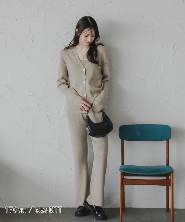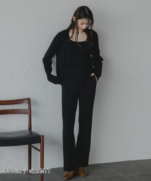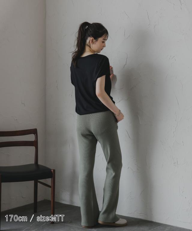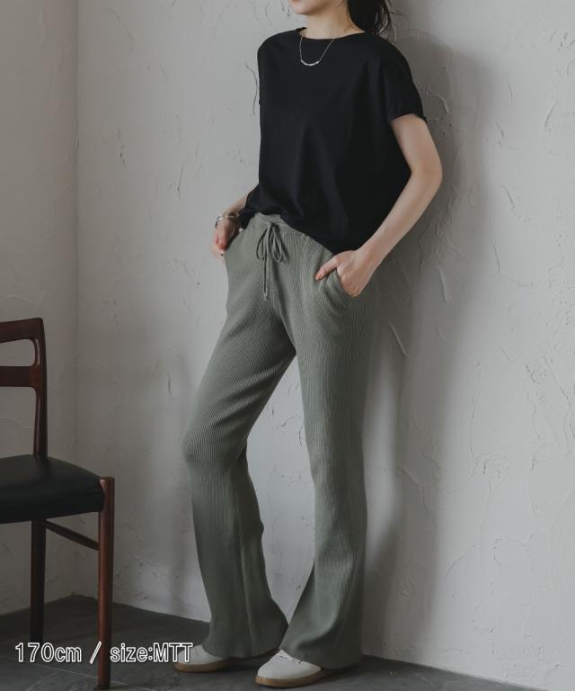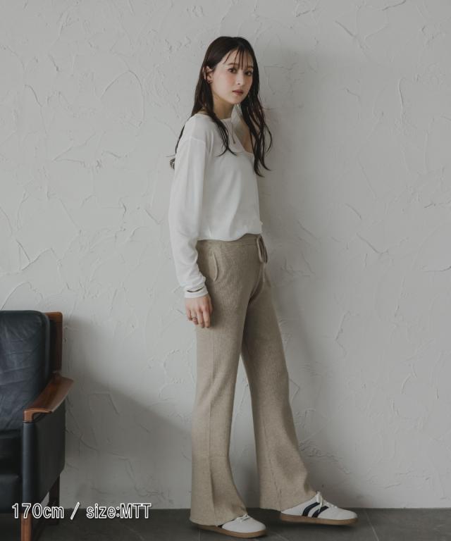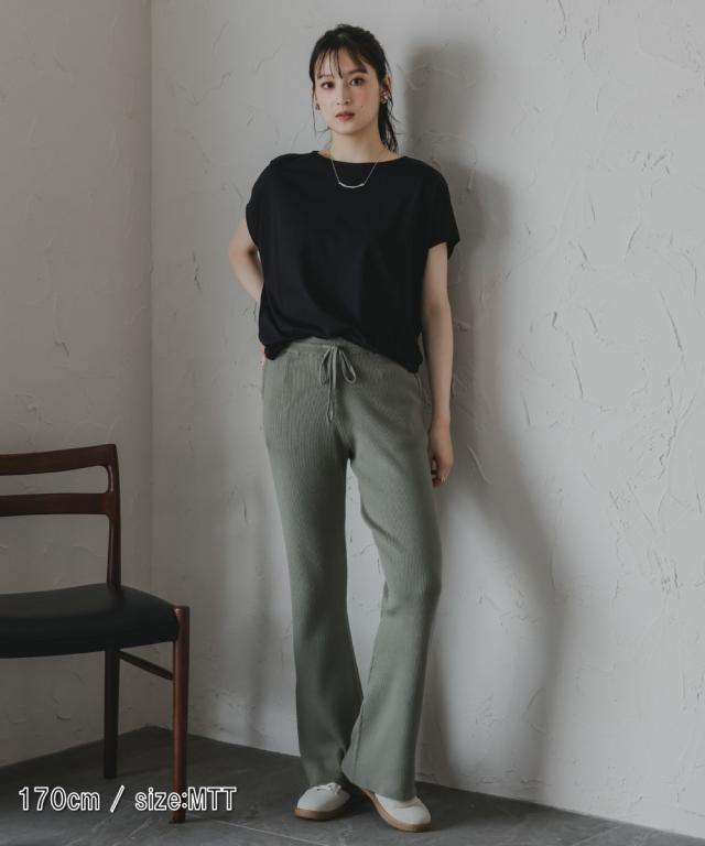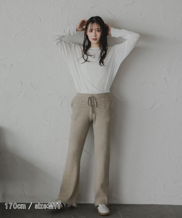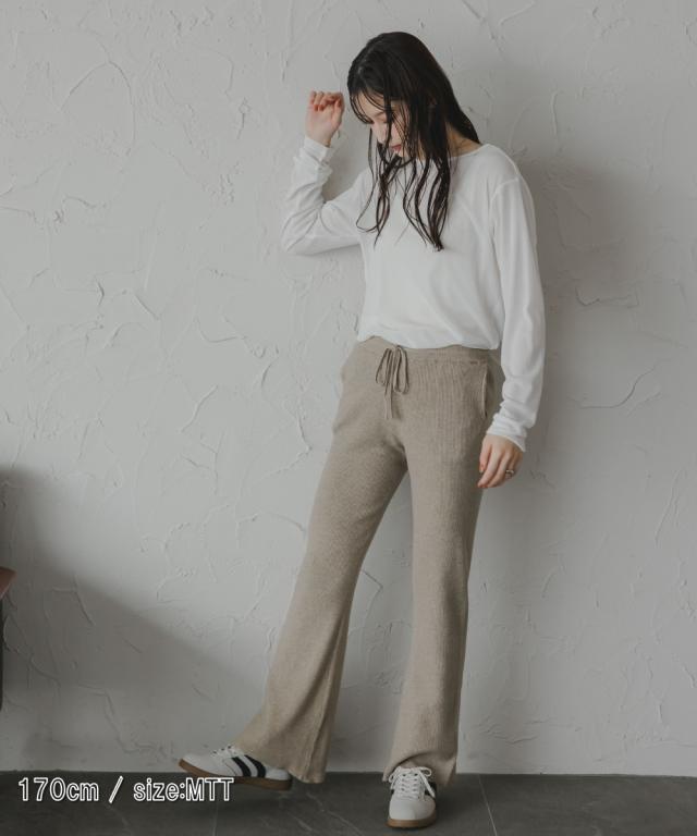 【高身長な方向け】きれい見えが叶うフレアシルエットニットパンツ ■デザイン ・シルエットが綺麗に映える脚長効果あるフレアシルエットデザイン。・伸縮性あるリブ編みニットで窮屈感なくご着用いただけます。・ウエスト総ゴムひも入りでラクチンです。 ■素材 ・リブ編み(12ゲージ)・肌触りは柔らかでやや起毛しています。チクチクかんはありません。 ■おすすめのスタイリング 同素材のアンサンブル(商品番号:AFG0425D0006)とセットアップで着用可能です。大きめシルエットのTシャツやトレーナーを合わせたトレンド感あるスタイリングがおすすめです