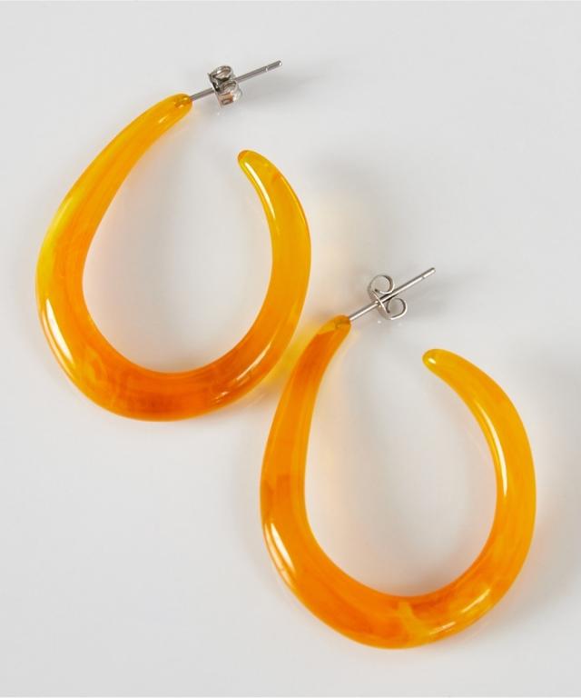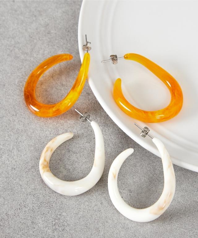 【ステンレスピアス】上品マーブルカラーのフープ風ピアスで大人キレイ目を演出洗練された大人の女性にぴったりの、マーブルカラーが美しいフープ風ピアスが登場しました。シンプルながらも存在感のあるデザインは、日常使いから特別な日まで、幅広いシーンで活躍します。お顔周りを華やかに彩り、上品なキレイ目スタイルを叶えるピアスです。魅力的なマーブルカラーとフープ風デザインこちらのピアスは、深みのあるオレンジと、柔らかな印象のホワイトの2色展開。どちらも繊細なマーブル模様が施されており、一つとして同じものがない、あなただけの特別なピアスです。フープ風のデザインは、耳元に軽やかな動きをプラスし、顔周りをすっきりと見せてくれます。カジュアルな装いにはもちろん、オフィススタイルやフォーマルな場面にもマッチする、万能なピアスです。お肌に優しいステンレスポスト採用ピアスのポストとキャッチ部分には、お肌に優しいステンレス素材を使用しています。お肌が敏感な方にも安心してお使いいただけるよう配慮しました。毎日身につけるものだからこそ、素材にもこだわりたいという方におすすめのステンレスピアスです。手作りの温かみと個性を楽しむこのピアスは一つ一つ