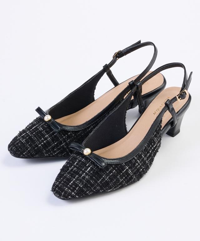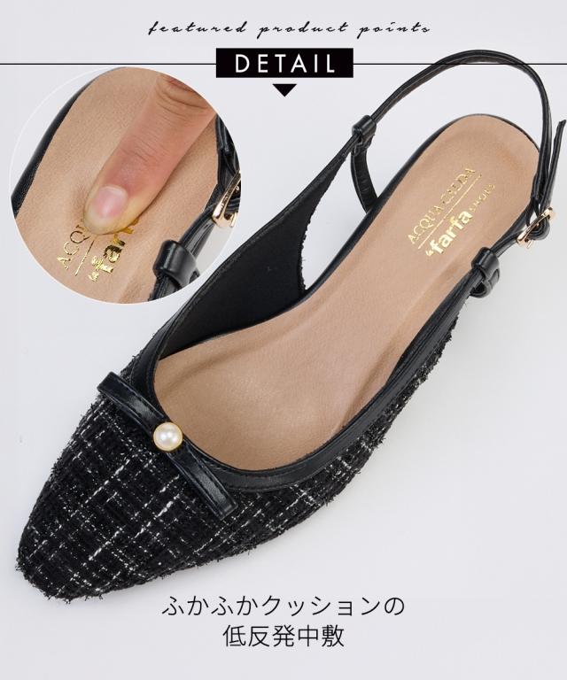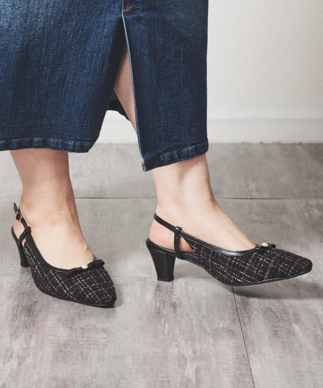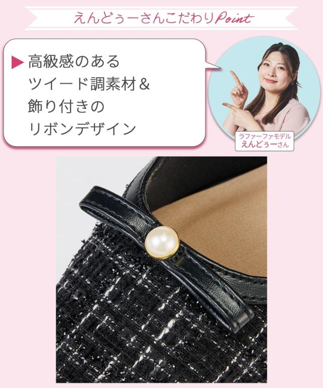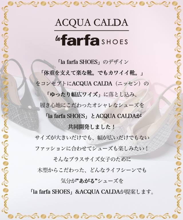 ラファーファモデル「えんどぅ」さんと「lafafa SHOES」×「ニッセン ACQUACALDA」のコラボ企画! 「大きくても可愛い靴が履きたい!おしゃれしたい!」そんなプラスサイズ女子のために誕生したlafafa SHOESとスマイルさんに向けてゆったり幅広シューズを開発してきたニッセンとのコラボ企画です。 リボンデザインが可愛いミュールデザインパンプス。高級感のあるツイード調素材と飾り付きのリボンデザインです。サイズ調整のしやすいバックストラップ仕様になっており、隠しゴムと合わせて自分のフィットするサイズ感で着用頂けます。 ■ポイント ・高級感のあるツイード調素材&パール調パーツ&リボンでフェミニンスタイル ・低反発クッションの中敷き仕様で優しい履き心地 ・屈曲性のあるソールは歩行時の足裏に馴染み歩きやすい ・内側メッシュで優しい履き心地 ・ベルト内側隠しゴムで脱ぎ履きがラク ・ベルトはサイズ調整可能 【ニッセンオリジナルの大きいサイズ規格】 本当に合う靴に出会った事はありますか ニッセンの4Eは、靴底の幅を広げ、甲や足首周りもゆったりの独自設計。 靴のサイズにお悩みのお客様へ向けて、サイズが大きくてもバランス良くきれいに見えるよう企画したオリジナ
