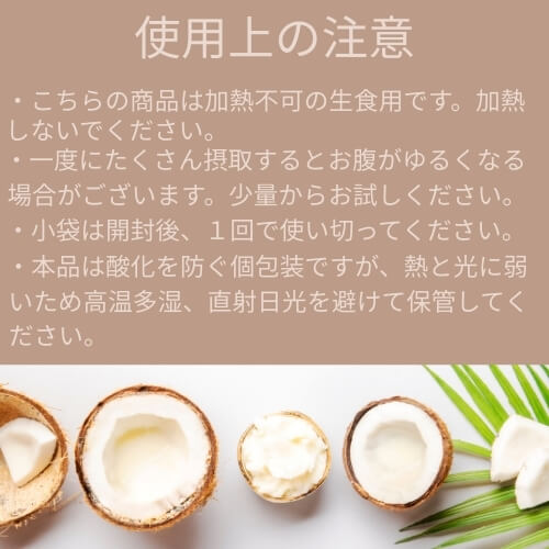 ●本品は加熱調理用の油ではありません。揚げ油、炒め油として使用すると煙が出たり、泡立ちが起こり危険です。熱をかけずにお召し上がりください。 ●一度にたくさん摂取すると、お腹がゆるくなる場合があります。初めてご使用される場合は、少量からお試しください。 ●発泡ポリスチレン容器(カップラーメンなど)には使用しないでください。容器の内側が変質し、薄くなる場合があります。 ●一度小袋を開封したら、一回で使い切ってください ●開封時、中身の飛び散りにご注意ください。 ●開封後はなるべく早くお召し上がりください。 |