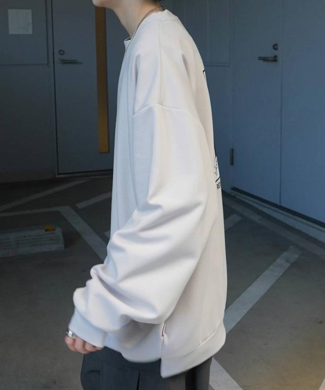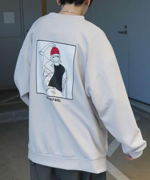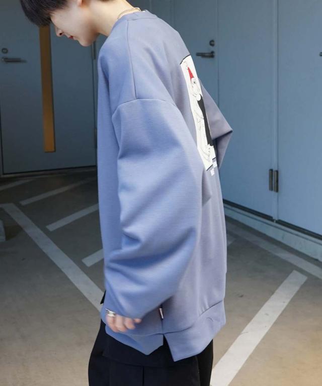 バックを彩るイラストプリントが印象的なクルーネックスウェット。
