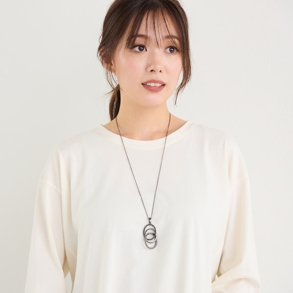 3連に重なった、楕円形モチーフが目を引くネックレス。