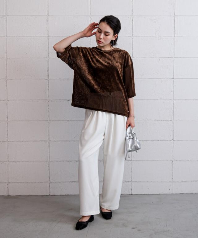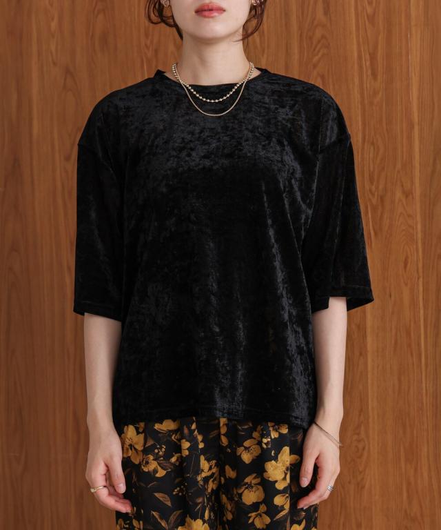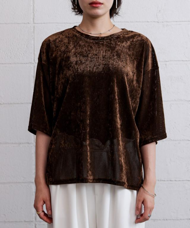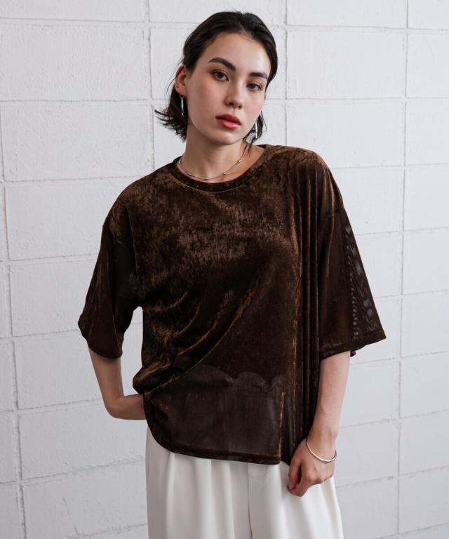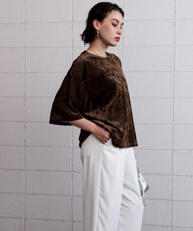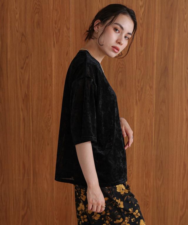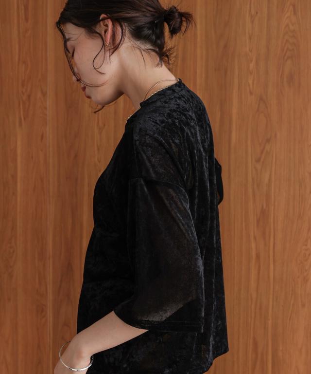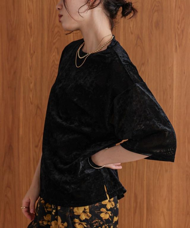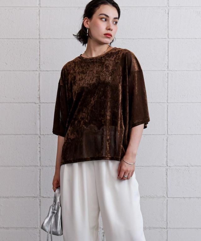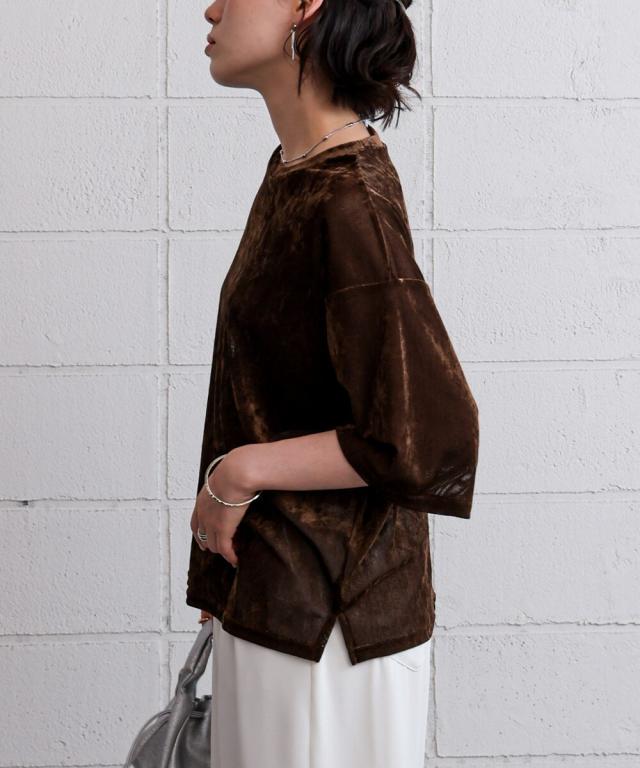 ほんのり透け感のあるシアーベロア素材が、上品な艶と抜け感を演出。ゆったりとしたシルエットに5分袖のバランスが絶妙で、シンプルながらもこなれた印象に。まだ暑さの残る季節から、秋のムードをさりげなく取り入れられる一枚です。