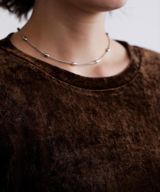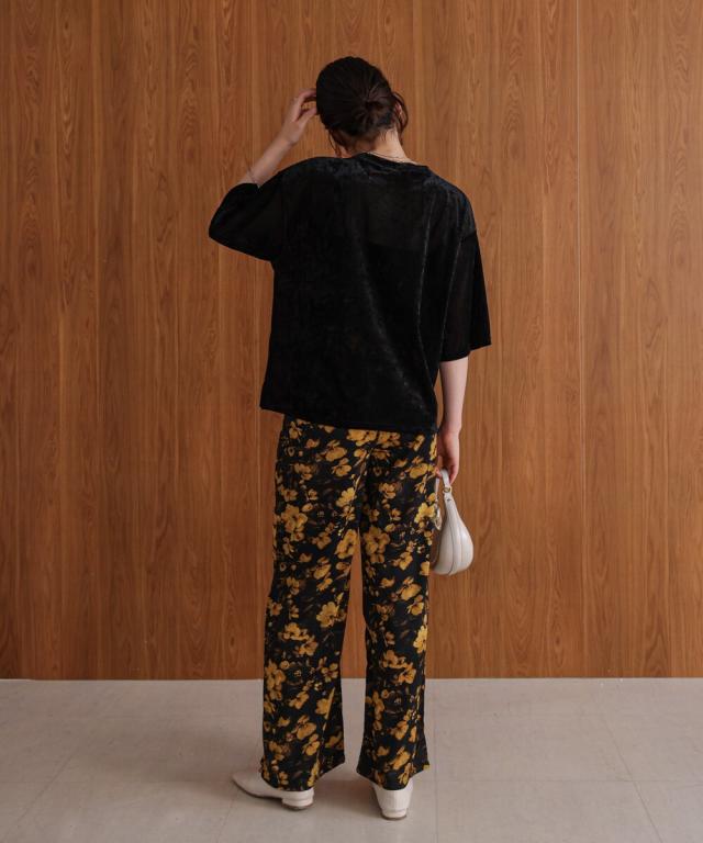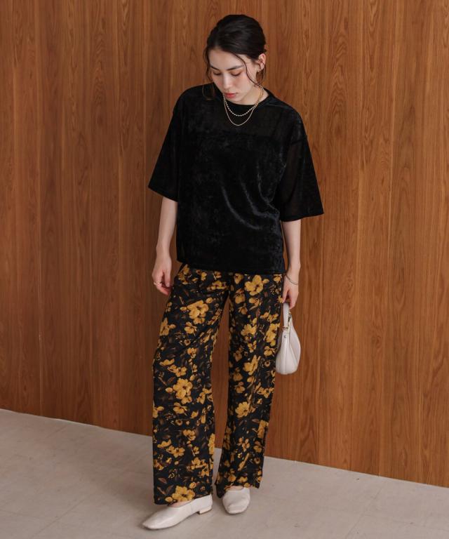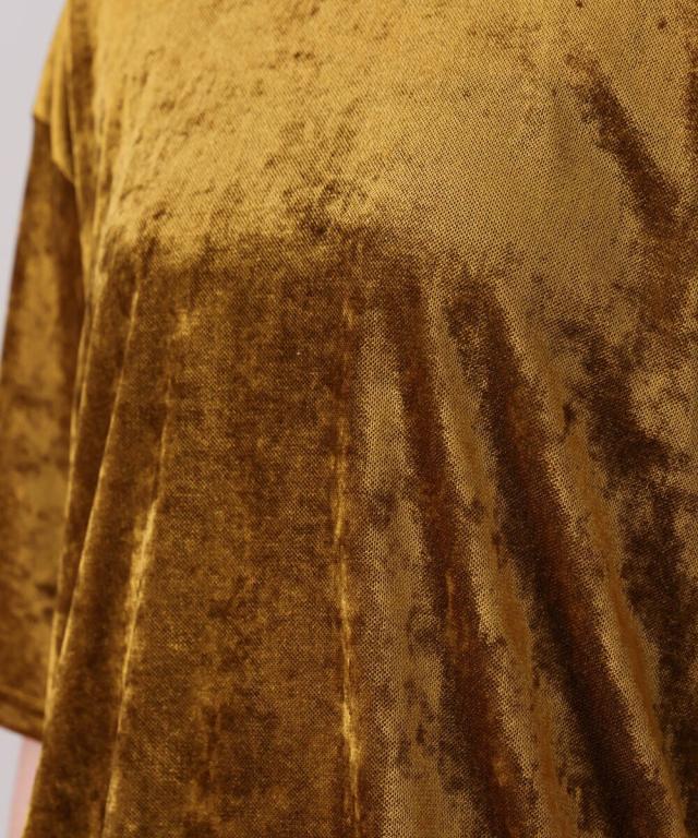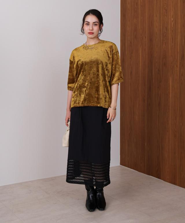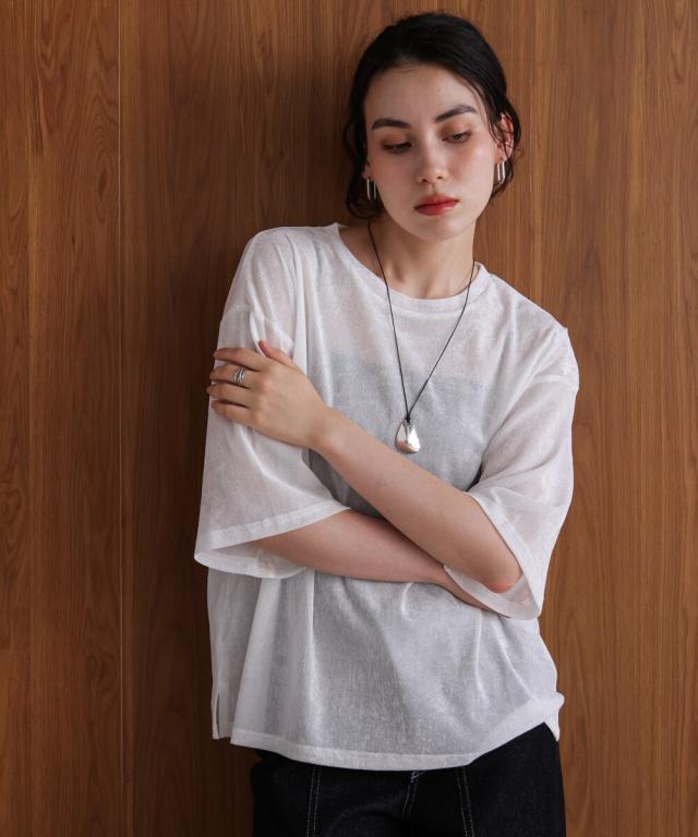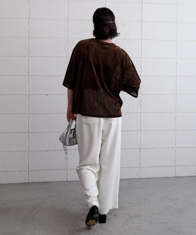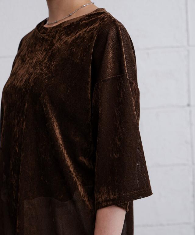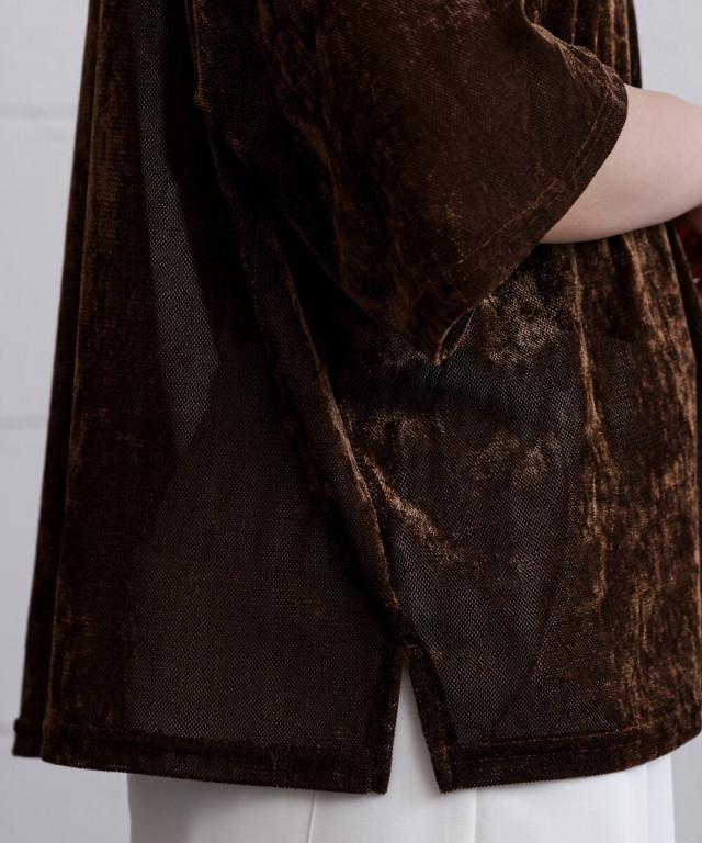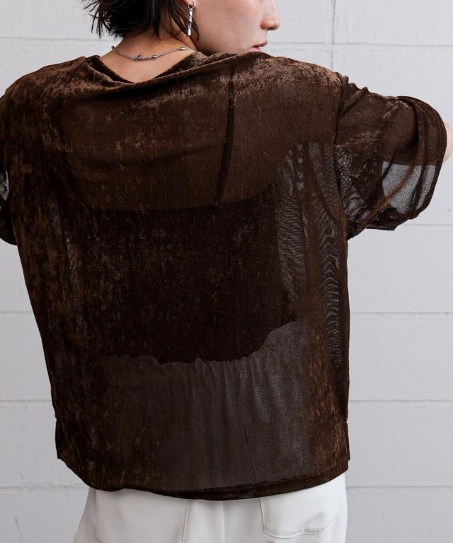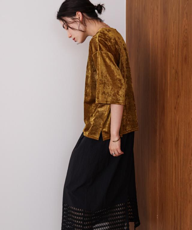 ほんのり透け感のあるシアーベロア素材が、上品な艶と抜け感を演出。ゆったりとしたシルエットに5分袖のバランスが絶妙で、シンプルながらもこなれた印象に。まだ暑さの残る季節から、秋のムードをさりげなく取り入れられる一枚です。