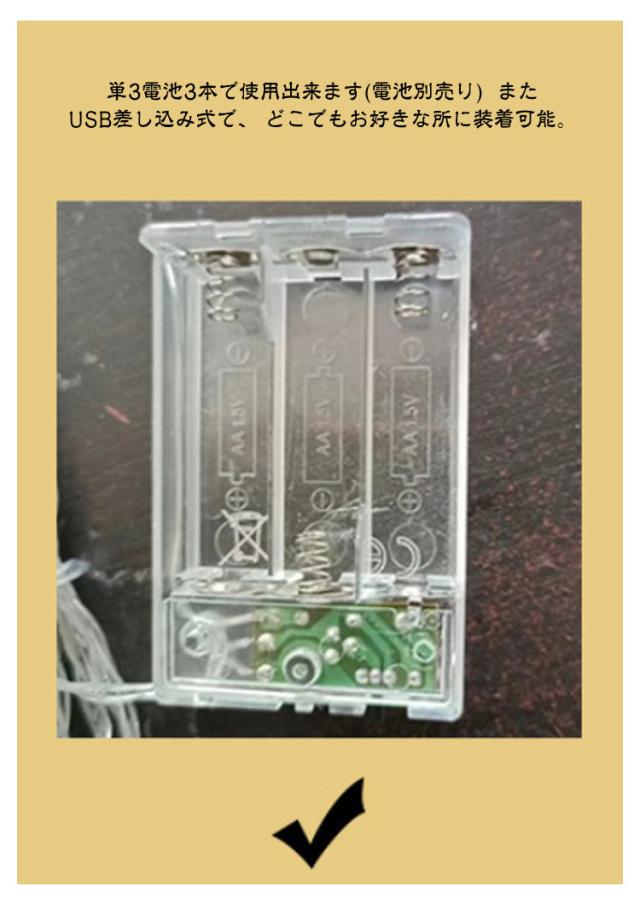 | サイズについての説明 | 【仕様】:USB+電池式2way給電タイプ 【電圧】: 3V 【防水性能】:生活防水 【ご注意】:USBで給電する場合、最初に電池を取り外してからスイッチをオンにしてライトをオンにする必要があります。 |
