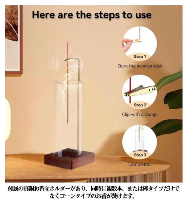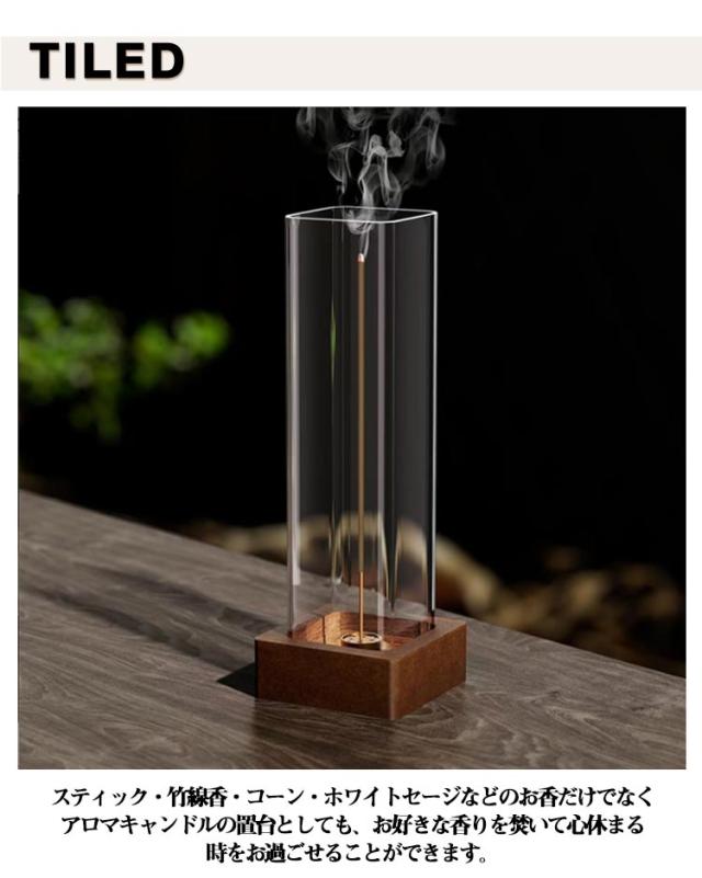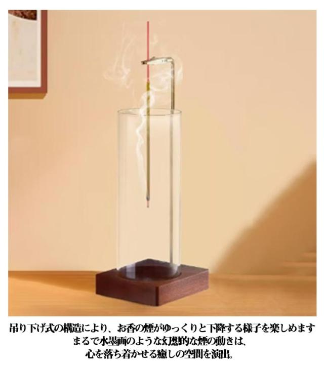 | 吊り下げ式 ガラスお香立て 灰が散らからない 吊り下げ式の構造により、お香の煙がゆっくりと下降する様子を楽しめます。まるで水墨画のような幻想的な煙の動きは、心を落ち着かせる癒しの空間を演出。 スティック・竹線香・コーン・ホワイトセージなどのお香だけでなく、アロマキャンドルの置台としても、お好きな香りを焚いて心休まる時をお過ごせることができます。 天然木ウォールナット台座は、温かみのある質感と重厚な佇まい。 付属の真銅お香立ホルダーがあり、同時に複数本、または棒タイプだけでなくコーンタイプのお香が焚けます。 通常のものよりも高いガラスカップが付属しており、お香が最後まで燃焼しても灰が外に落ちることはありません。 和のエッセンスを現代的にアレンジした洗練されたデザイン。どんなインテリアにも自然に溶け込み、空間のグレードを高めます。 ガラスパーツは取り外し可能で水洗いができ、お香の残り香もすっきり。いつでも清潔に長く美しい状態を保てます。 邪魔にならないコンパクトさは置き場所また好きな場所に移動させるのも困ず、仏壇用、ペットの供養、玄関、洗面所、キッチン、茶室、ヨガ、読書、寝室などさまざまなところでも置けるインセンスホルダーです。 | |