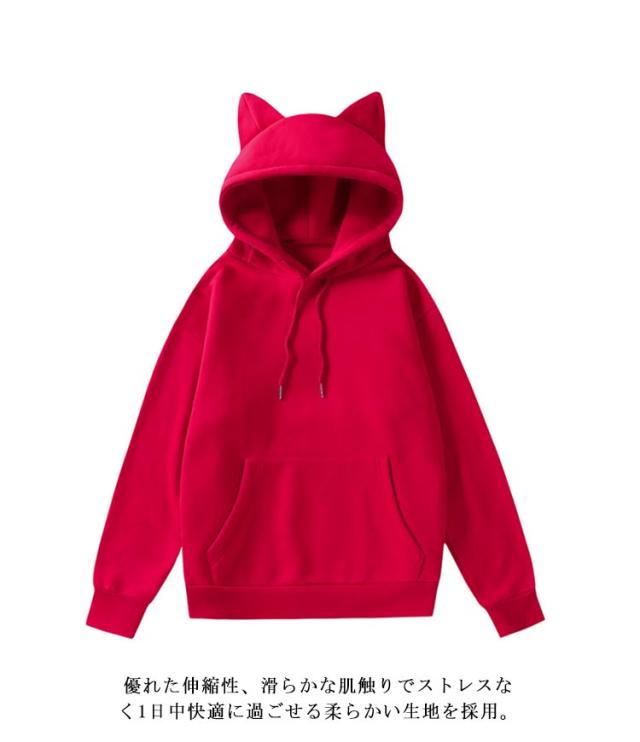 | 猫耳付きデザインの無地パーカーです。 パーカーはトレンドのプルオーバデザインを採用。 優れた伸縮性、滑らかな肌触りでストレスなく1日中快適に過ごせる柔らかい生地を採用。 スタイリッシュな見栄えに仕立ててくれ、休日でもカッコ良くスタイリング。 デニムやチノ、スカートスタイルなど様々な着こなしができるおススメ品です。 スポーツやちょっとしたお出掛け、ルームウエアとしてお勧めのアイテムです。 | |