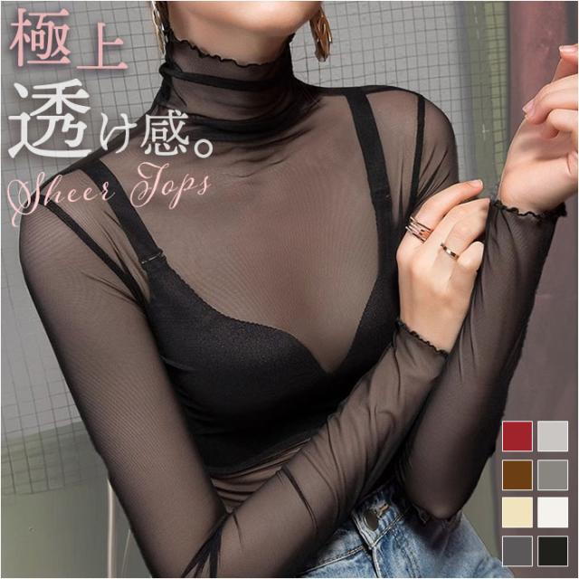 シアートップス 長袖 通販 シースルー トップス チュールトップス レーストップス 透け感 レディース 無地 ハイネック タートルネック メッシュ レイヤード 重ね着 インナー カットソー 春 夏 涼しい 薄手 レディースファッション