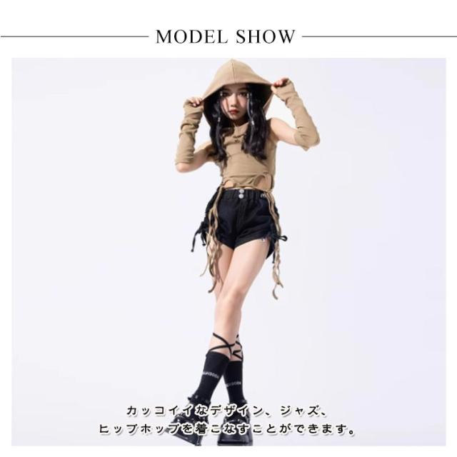 女の子 キッズ チアガール パンツ ダンス衣装 ジャズダンス チア セットアップ キッズダンス衣装 キッズ ヒップホップ 子供服 k-pop 韓国 ヘソ出し トップス フード付き スカート ワイドパンツ 砂色 グレー jazz hiphop
