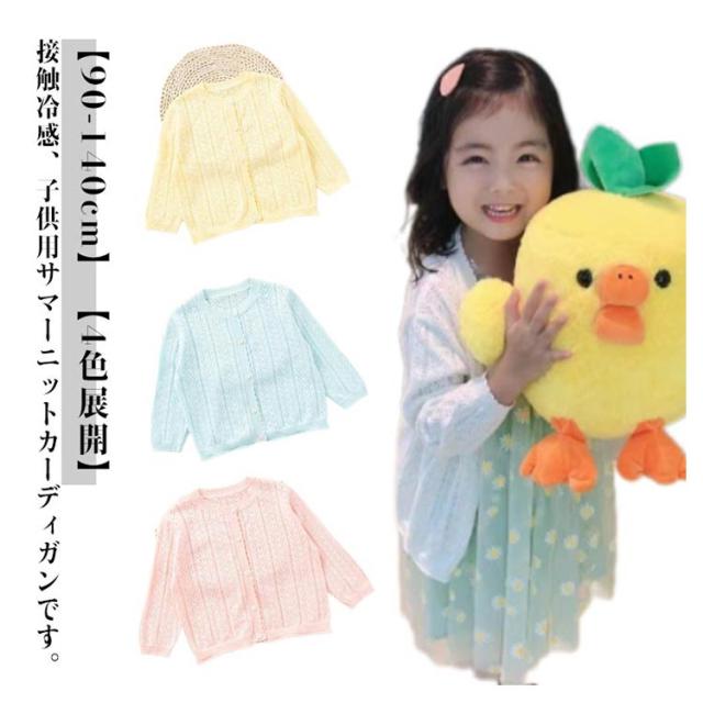 | 【90-140cm】【4色展開】【サマーカーディガン】 接触冷感、子供用サマーニットカーディガンです。 ニット特有のチクチク感はなく、安心して着ていただけます。 バランス良く着こなしやすい短めの着丈で、ワンピースや人気のフレアスカートとの相性はバツグン! 薄手なのでくるくるっと折りたためば、旅行やお出かけの体温調整に使え持ち運びにぴったり! | |