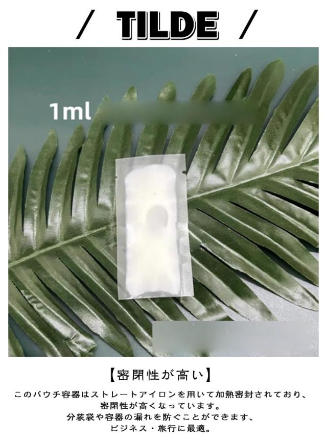 | 【パウチ容器】 【100枚入り!】 【1ml 2ml 5ml 10ml】 【密閉性が高い】このパウチ容器はストレートアイロンを用いて加熱密封されており、密閉性が高くなっています。分装袋や容器の漏れを防ぐことができます、ビジネス・旅行に最適。※使用するストレートアイロンなどの機器やキッチンペーパーの厚さなどにより、加熱時間は異なります。状況を見ながら加熱してください。※やけどには十分ご注意ください。 【持ち運び便利】この小さい袋入り重量が軽くて持ち運びやすいです。シャンプー、乳液、ボディ石鹸、クリームを保管するのにとても適しています。化粧ポーチや鞄やスーツケースは入れて、軽いでスペースは占めませんです。 【安心な素材】パウチ容器は優良品質のPET素材を採用して、子供に接触しても問題がありません。 【幅広い用途】このトラベルパウチは旅行用のシャンプー、乳液、マッサージオイル、ボディソープ、その他の化粧品、シャワー製品を包装するのに適しています。休暇であろうと出張であろうと、当社の小袋は、お客様に快適なソリューションを提供します。重いボトルとお別れし、コンパクトで効率的な体験を迎えましょう。 | |