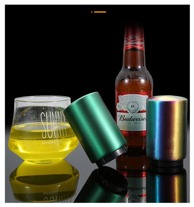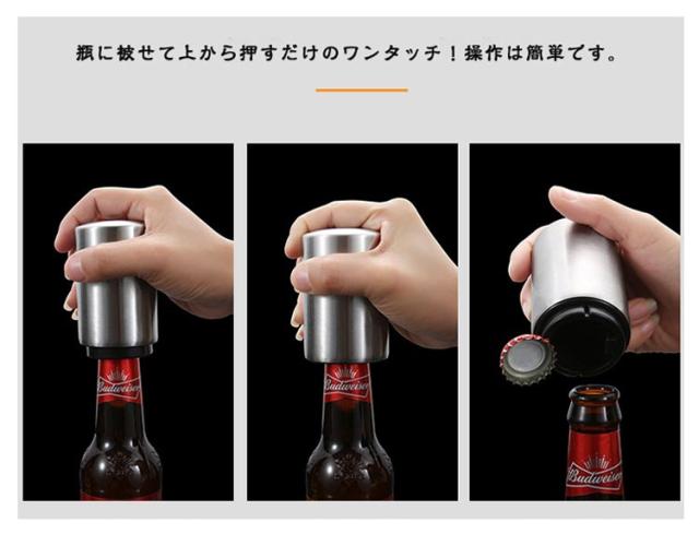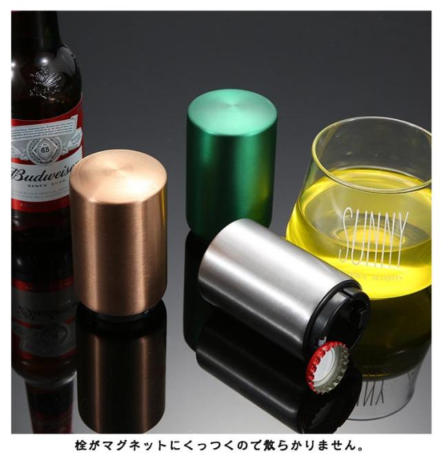 | 見た目もオシャレで高級感がありボトルオープナーです。 瓶に被せて上から押すだけのワンタッチ!操作は簡単です。 力がいらないので老若男女誰にでも簡単に扱えます。 栓がマグネットにくっつくので散らかりません。 家庭やパーティーやレストランなどに活躍です。 | |