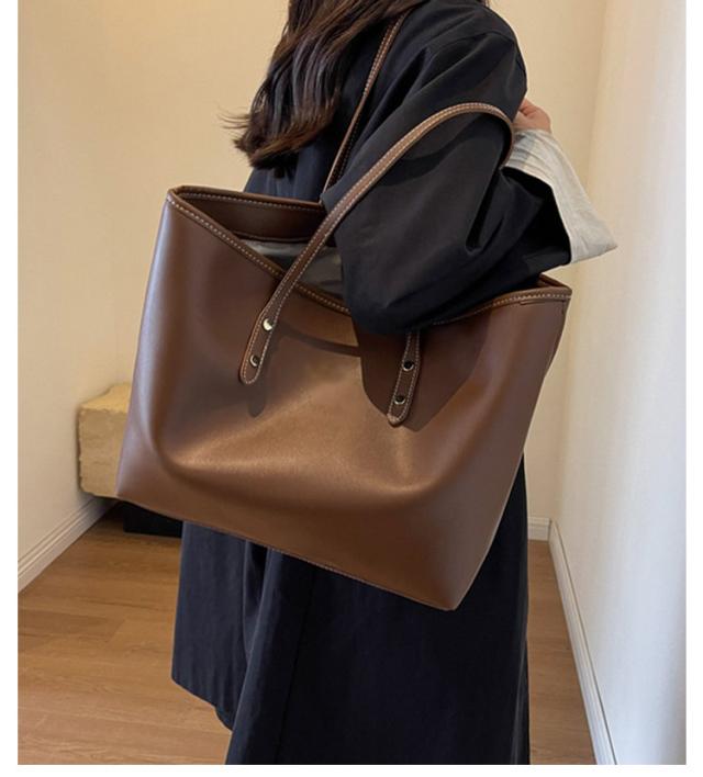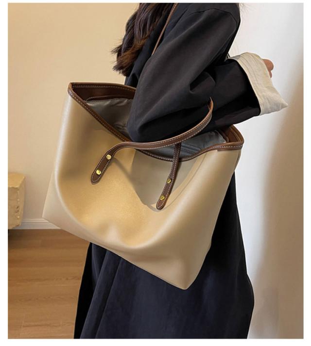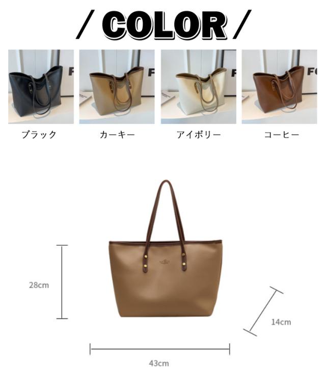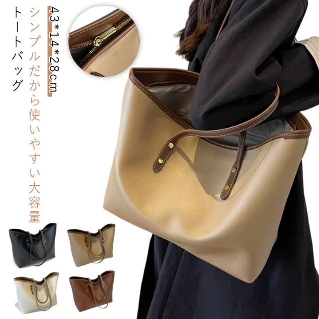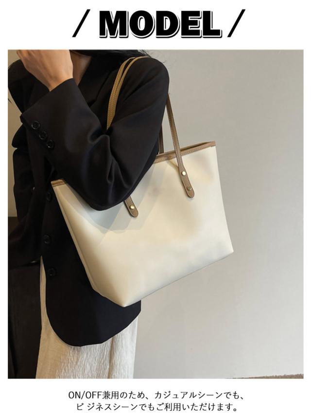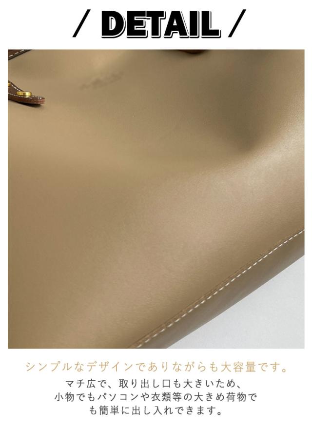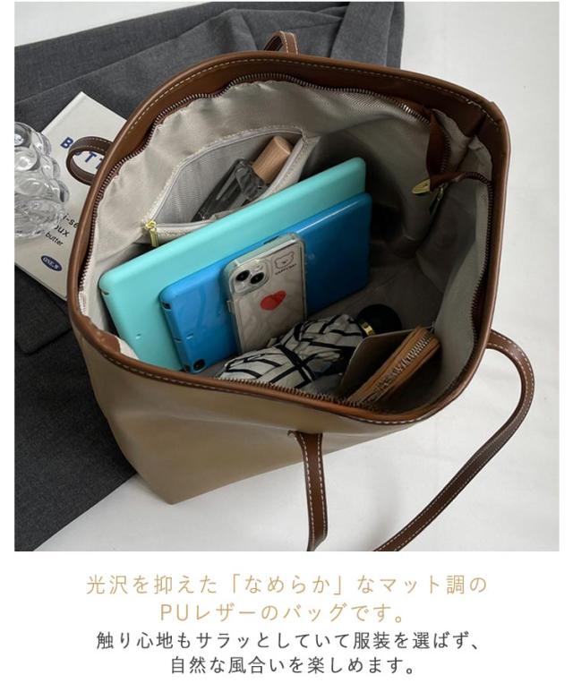 | シンプルだから使いやすい大容量トートバッグ シンプルなデザインでありながらも大容量です。マチ広で、取り出し口も大きいため、小物でもパソコンや衣類等の大きめ荷物でも簡単に出し入れできます。 安心のファスナー式で荷物が見えないです。 光沢を抑えた「なめらか」なマット調のPUレザーのバッグです。触り心地もサラッとしていて服装を選ばず、自然な風合いを楽しめます。 ON/OFF兼用のため、カジュアルシーンでも、ビジネスシーンでもご利用いただけます。 | |